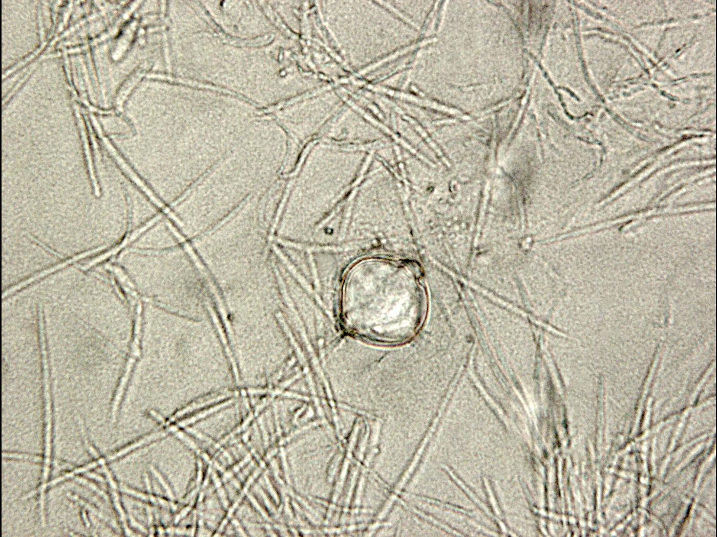 : Entyloma spp. est le seul représentant des Ustilaginales a produire deux types de spore. Les plus fréquemment observées sont les ustilospores qui sont dans les cellules végétales. Les autres spores, moins souvent observées, se retrouvent en surface de la feuille et sont filiformes.