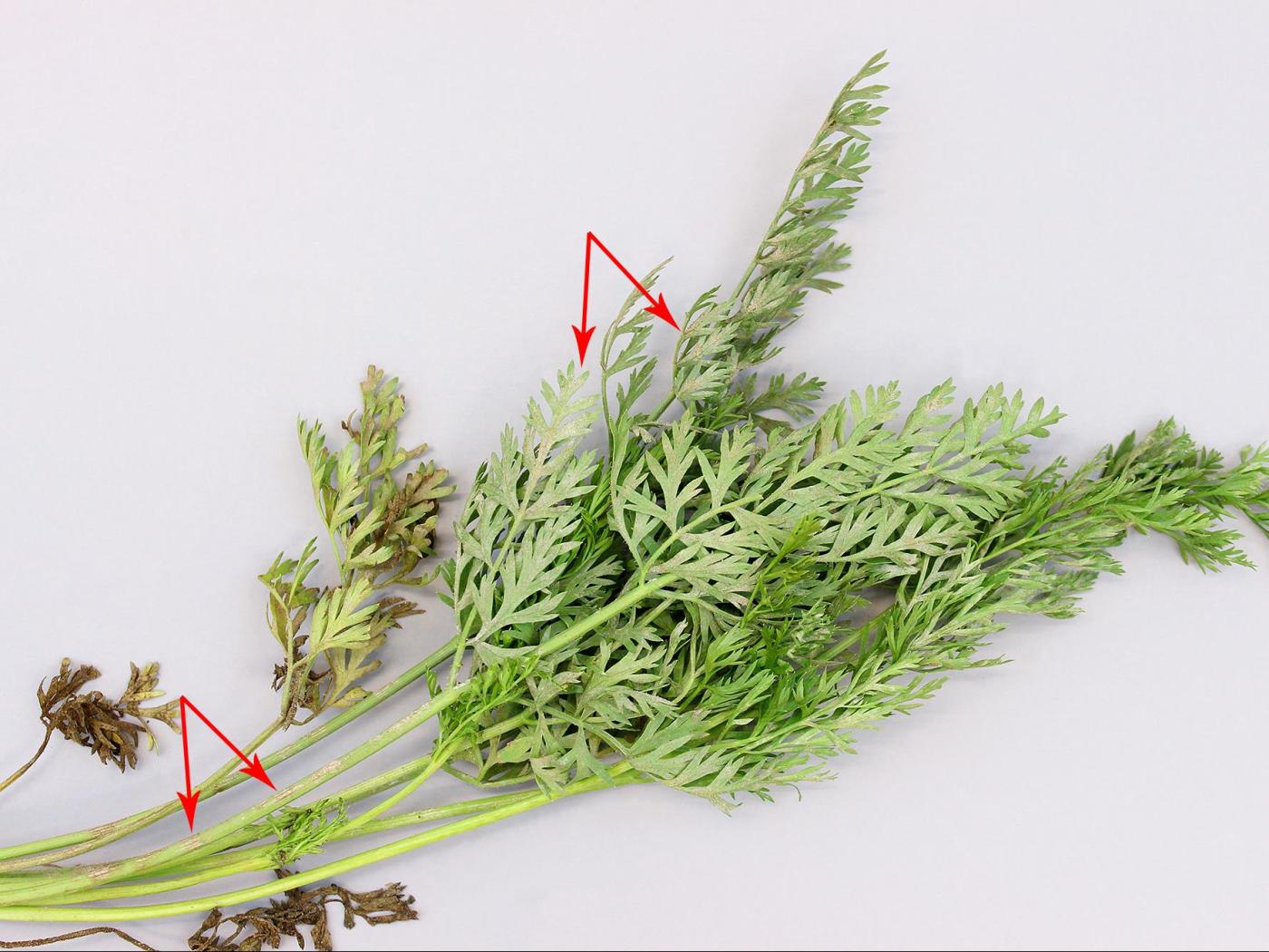 Légende: Mycélium blanc sur feuilles de carotte