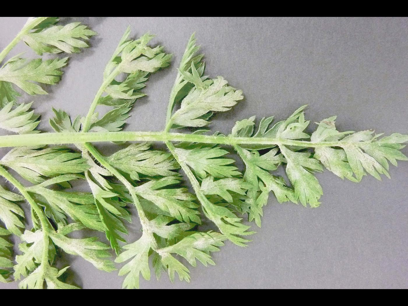 Description: Sur des feuilles de carotte, présence d’un fin duvet blanchâtre à grisâtre à la face inférieure et sur les pétioles (voir flèches). Les feuilles affectées prennent une coloration jaune puis brune et dépérissent. Les observations microscopiques ont révélé la présence de mycélium et de conidies du champignon Erysiphe sp., responsable de la maladie du blanc (oïdium). Il s’agit probablement d’Erysiphe heraclei, rapporté chez la carotte.
