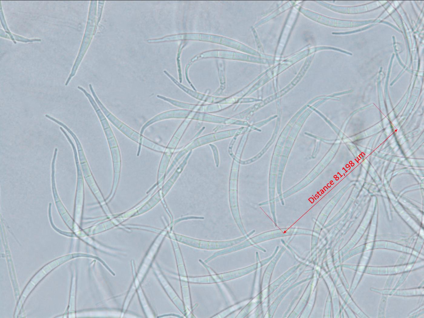 - Macroconidies : Longues et minces phragmospores à 5-7 septations transversales; une septation centrale est souvent présente. En forme de faucille - côté dorsal et côté ventral nettement arqués. Cellule apicale effilée et allongée ou en forme de fouet (caractéristique importante de cette espèce). Cellule basale en forme de pied allongé. Pouvant être regroupées en sporodochies orange. Dimension : 22-45 × 3,5-5 μm (si 3 septations), 40-58 x 3,7-5 μm (si 5 septations), 42-60 x 4-5,9 μm (si 7 septations).