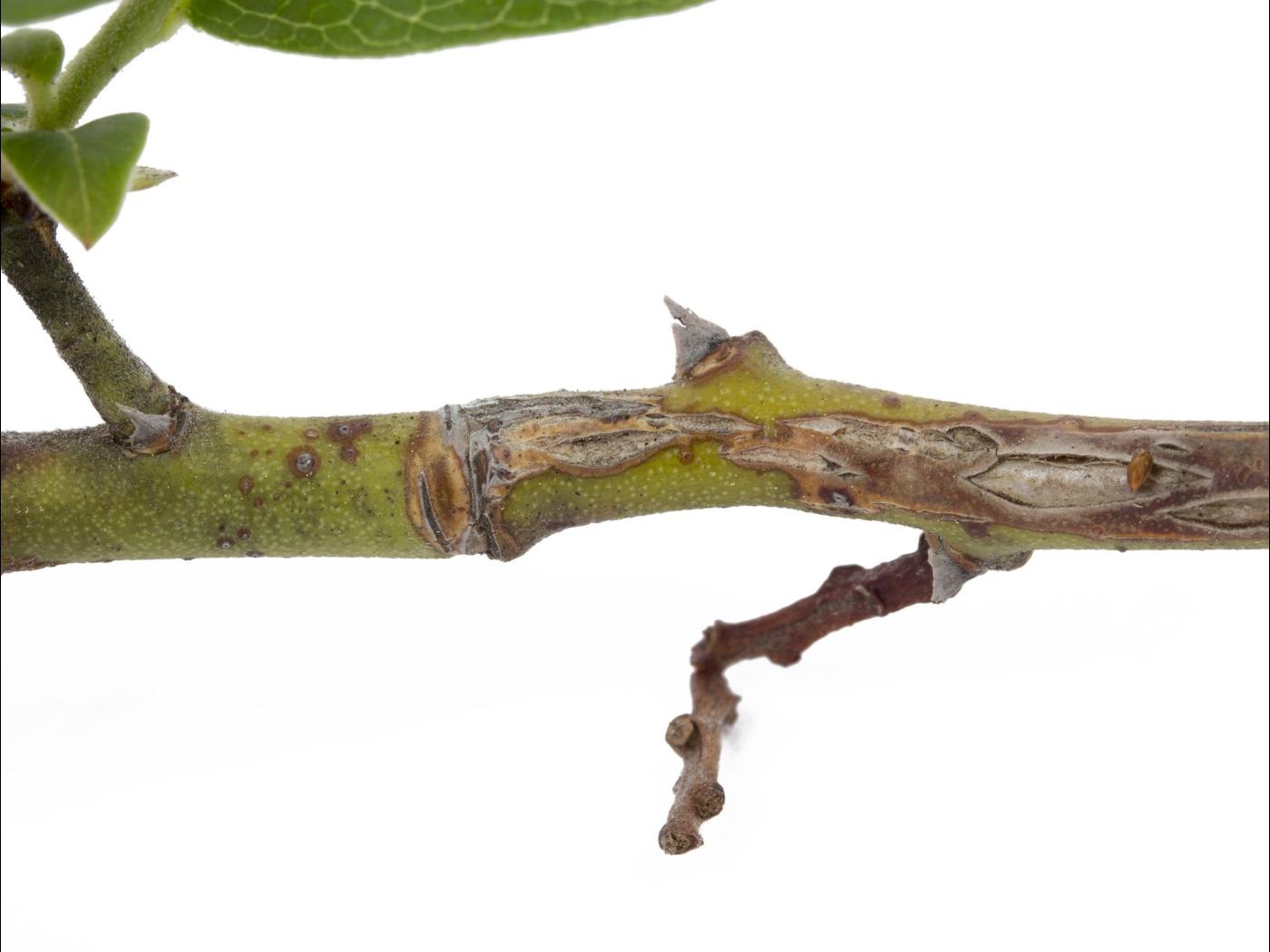 Tige : présence de taches rougeâtres localisées dans la partie basale des jeunes tiges de 1 à 2 années. Les taches entourent généralement les cicatrices foliaires. Ces taches évoluent en des chancres grisâtres entourés d’une large marge rougeâtre. En vieillissant, les chancres deviennent complètement gris et peuvent encercler la tige sur une longueur de 1 à 10 cm. La partie supérieure des tiges sèche et meurt. Généralement une à deux tiges meurent par plant, rarement tout le plant.