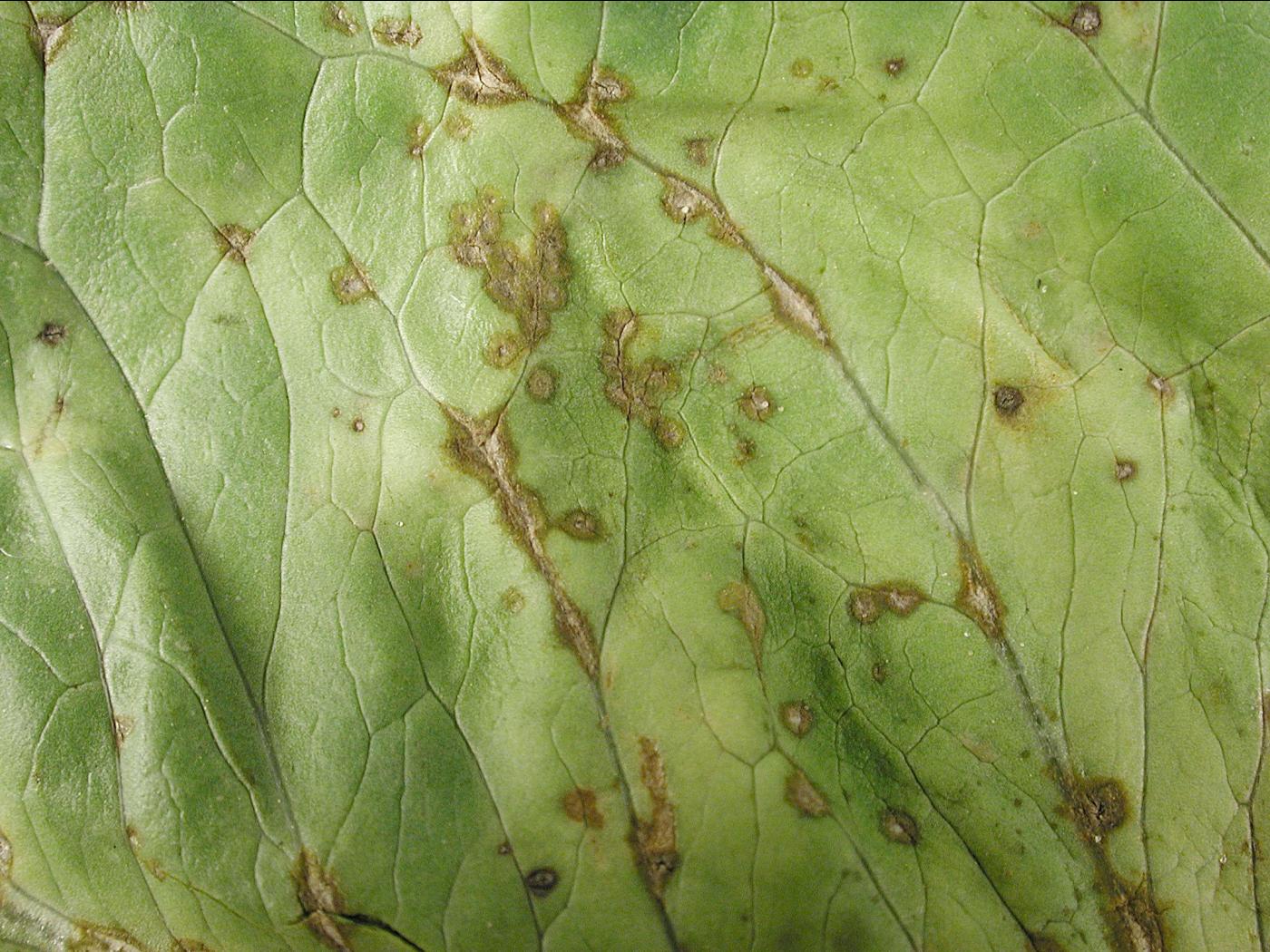Description: Une feuille de laitue montre de nombreuses taches blanchâtres à brunâtres ayant une marge plus foncée et présentant un halo jaune. Les taches ont une forme ovale et elles mesurent entre 1 et 2 mm de longueur. Le centre des taches a tendance à tomber et à laisser une perforation. Elles sont réparties au hasard sur le limbe ou le long des nervures principales et secondaires et la feuille compte de très nombreuses taches. Sur les nervures principales, les taches sont allongées et ont une coloration… En savoir plus