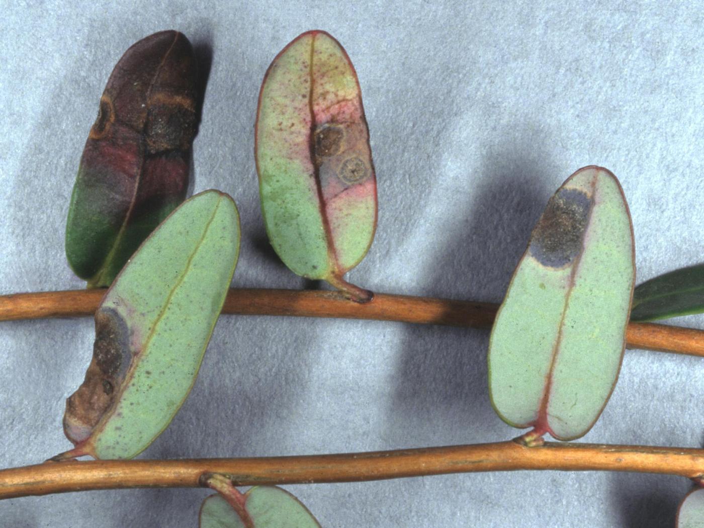 Légende: Taches circulaires brunes à noires sur feuilles de canneberge
