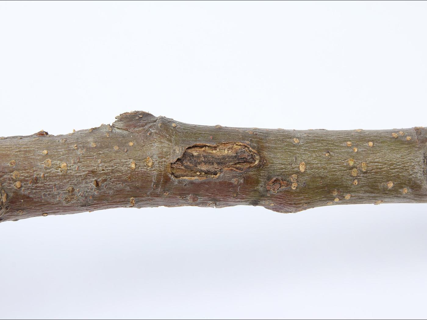 Branche et tronc : au début, présence de petites taches brun rougeâtre et déprimées sur les pousses annuelles et les rameaux d’un an. Le tissu cambial sous l’écorce meurt progressivement et l’écorce adjacente au cambium infecté s’enfonce, change de couleur et se fissure, causant une démarcation nette entre les tissus sains et affectés la première année. Les chancres deviennent alors apparents. Les années subséquentes, il n’y a plus de démarcation franche entre les tissus sains et affectés et le chancre est entouré d’anneaux cicatriciels de plus en plus gros. L'écorce détruite laisse le bois nu au centre du chancre. Lors de conditions humides, les jeunes chancres montrent des fructifications asexuées blanchâtres (conidies) et sur les chancres plus âgés, des fructifications sexuées orange vif (périthèces) sont produites. À maturité, les fructifications sont rouges puis deviennent noires avec l’âge. Les chancres sont souvent concentrés sur les petites branches et il peut y avoir plusieurs chancres par arbre.