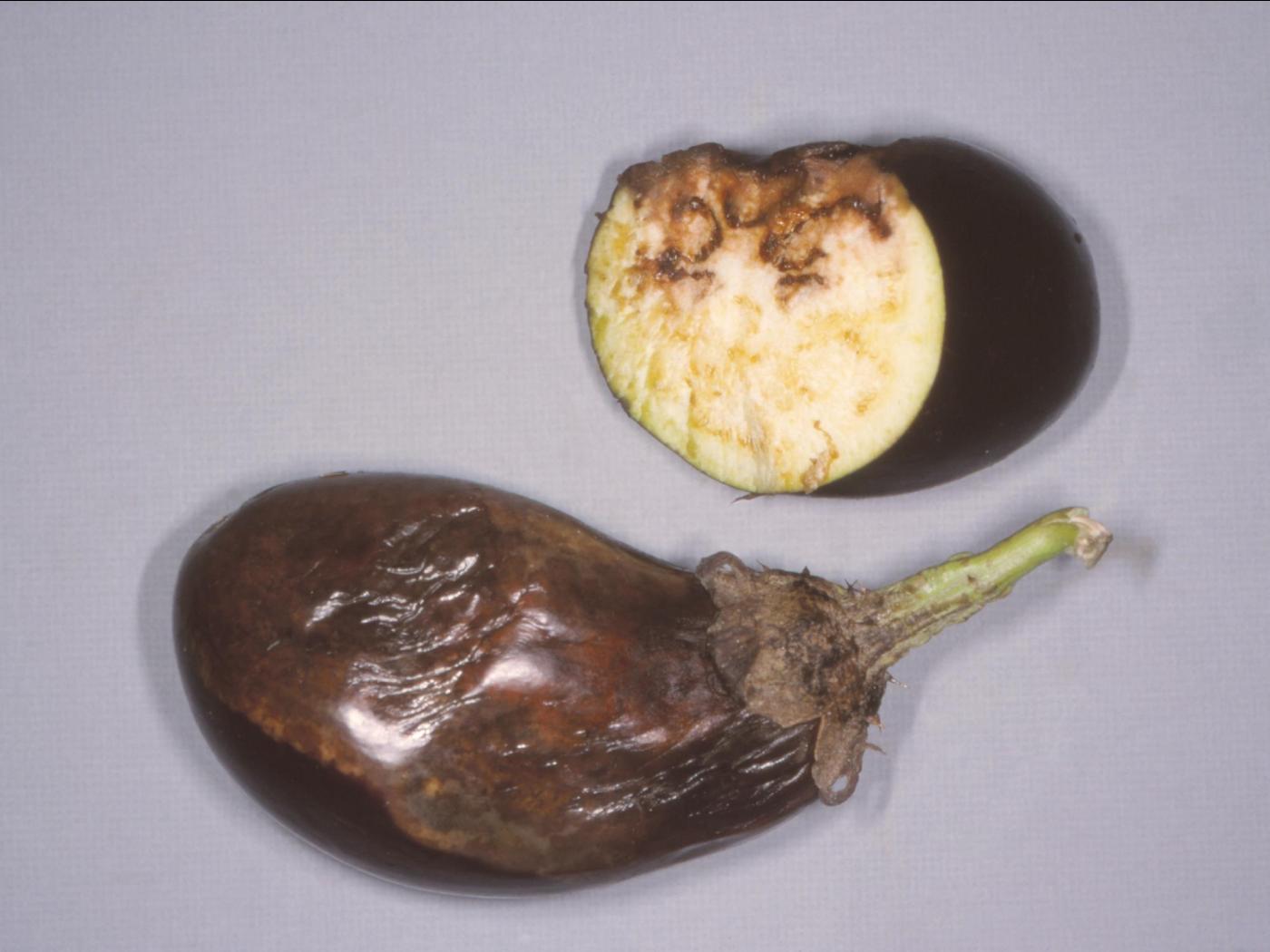 Description: Des aubergines montrent une pourriture brune mi ferme qui pénètre dans la chair. La moitié du fruit est affecté. Les observations microscopiques ont révélé la présence de sporanges du champignon Phytophthora sp., responsable de la pourriture des fruits. Il s’agit probablement de P. capsici, rapporté pour causer de la pourriture des fruits chez l’aubergine.   La conseillère agricole mentionne que les fruits affectés sont localisés dans des baissières sur un sol dont le drainage est passable.