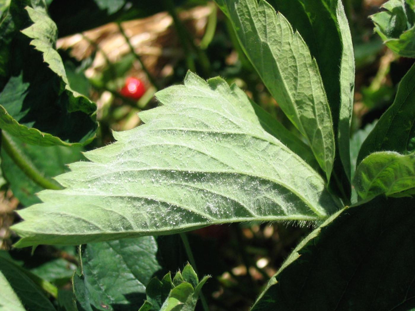 Description: À la face inférieure d’une foliole de fraisier (cv 'Chambly'), présence d’un fin duvet blanc de mycélium (voir flèche) et d’un enroulement de la foliole vers la face supérieure. Les observations effectuées à la loupe ont confirmé la présence du champignon Sphaerotheca macularis, responsable du blanc du fraisier.