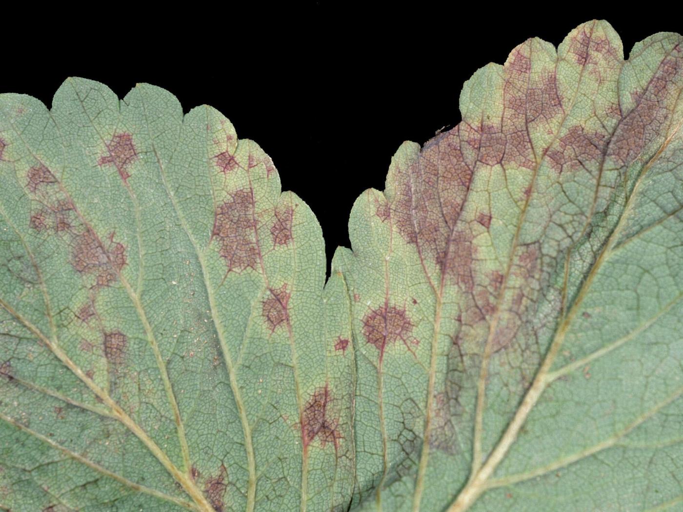 Description: À la face inférieure des folioles de fraisier (cv 'Seascape'), présence de taches circulaires à irrégulières, pourpres foncées à brunes et bordées d’un halo jaune. Ces taches sont vis-à-vis celles observées à la face supérieure. Les observations microscopiques ont confirmé la présence du champignon Sphaerotheca macularis, responsable du blanc du fraisier.