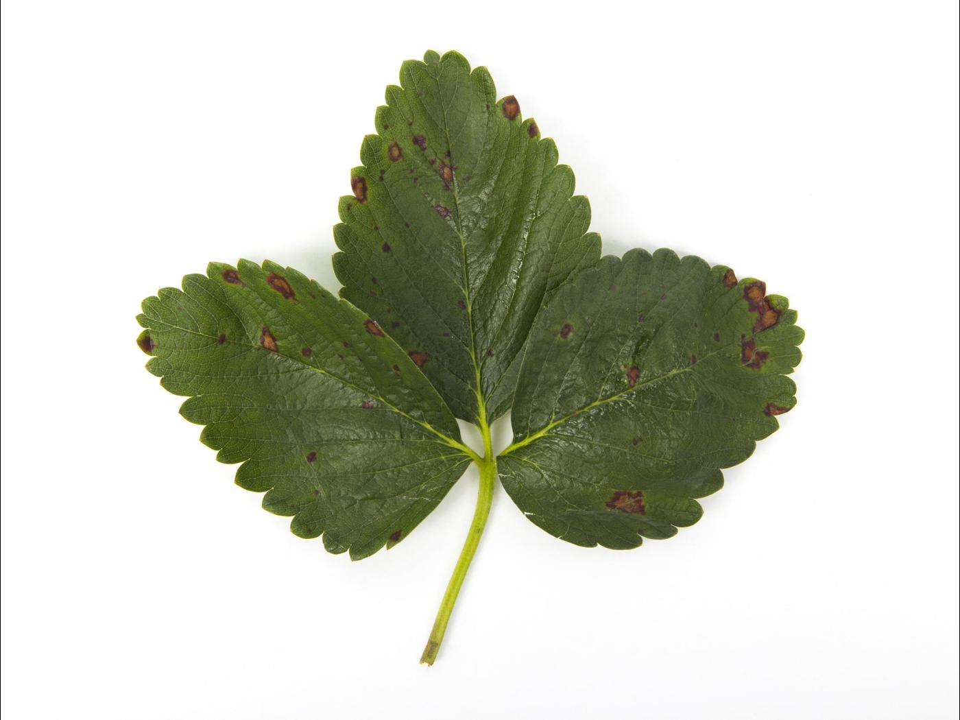 Description: À la face supérieure des folioles de fraisier (cv 'Seascape'), présence de taches circulaires à irrégulières, pourpres foncées à brunes et bordées d’un halo jaune. Les observations microscopiques ont confirmé la présence du champignon Sphaerotheca macularis, responsable du blanc du fraisier.
