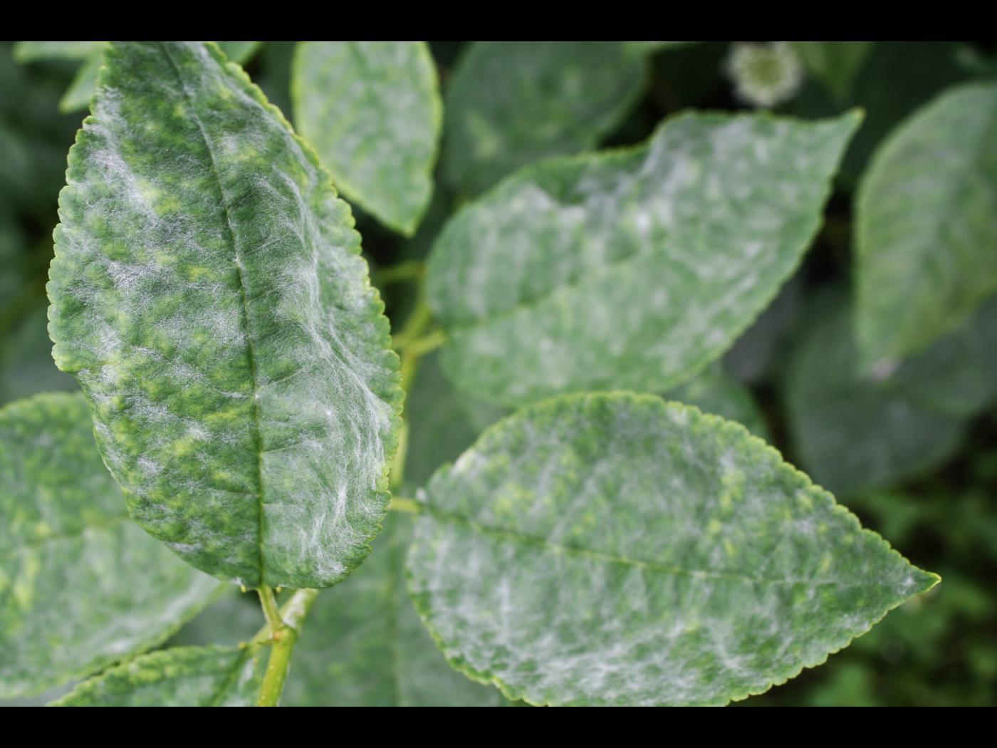 Description: Le duvet poudreux blanc sur les feuilles de ce cerisier nain rustique correspond au mycélium et aux conidies du champignon Podosphaera clandestina, responsable de la maladie du blanc.
