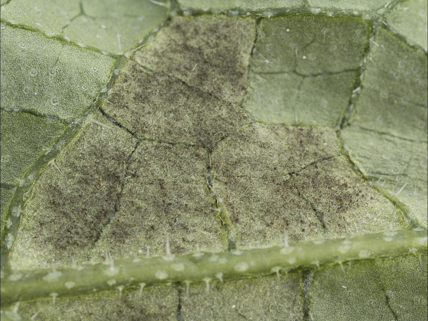 Feuille : à la face supérieure, les taches sont initialement jaunes et angulaires, puis deviennent brunes et peuvent former de larges plages brunes qui finissent par faire mourir les feuilles. À la face inférieure, les taches sont brunes et se couvrent de sporanges de P. cubensis, conférant une teinte brun-violacé au limbe. Les infections débutent toujours sur les vieilles feuilles et progressent vers les jeunes feuilles.
