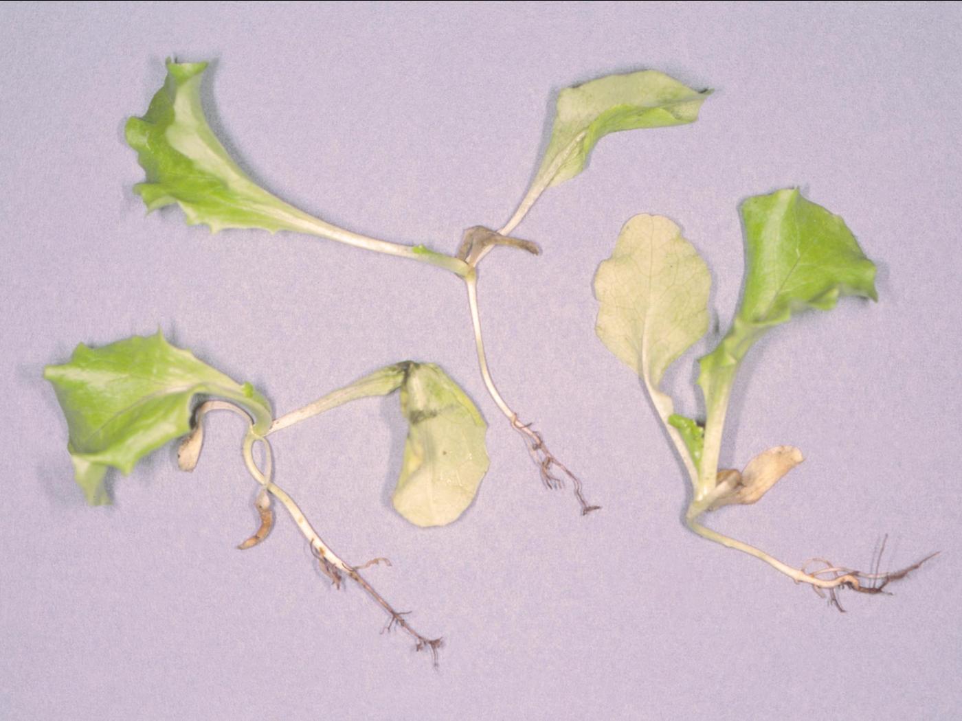 La laitue cultivée en culture hydroponique est particulièrement sensible à Pythium et à un degré moindre, aux Phytophthora spp. Les principales maladies sont la fonte des semis et la pourriture des racines (pourridié pythien) sur les plants plus développés. La fonte des semis se manifeste lorsque Pythium affecte la germination de la semence, la pré et postémergence des plants et le développement des racines ou de la tige des plantules plus développées. Chez la laitue, Pythium ultimum, P. irregulare, P. myriotylum et P. sylvaticum sont plus fréquents en pré et postémergence tandis que P. dissotocum, P. uncinulatum et P. violae affectent surtout l’apex des racines. Les jeunes plantules ont des tissus tendres et succulents qui les rendent plus sensibles à la maladie, particulièrement lorsqu’elles sont cultivées dans un sol trop froid. En champ, les laitues hâtives sont sensibles quand du temps froid et pluvieux survient après les semis. Les plants affectés sont distribués en foyer ou de manière éparse.
