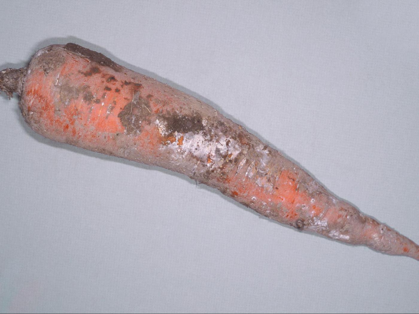 Légende: Taches déprimées et mycélium blanc sur carottes non lavées