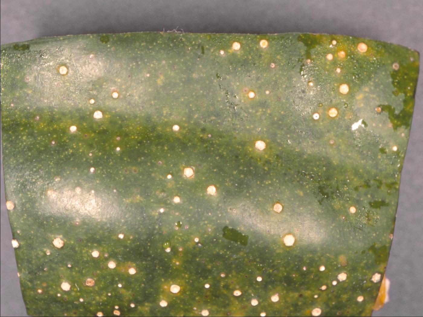 Fruit : présence de nombreuses petites taches ou lésions circulaires, beiges à brun pâle, mesurant 1 à 2 mm de diamètre et d’aspect verruqueux. Ces lésions sont superficielles, n’affectant pas la chair ce qui limite le développement de la pourriture lors de l’entreposage. Affecte généralement que les courges et la citrouille.