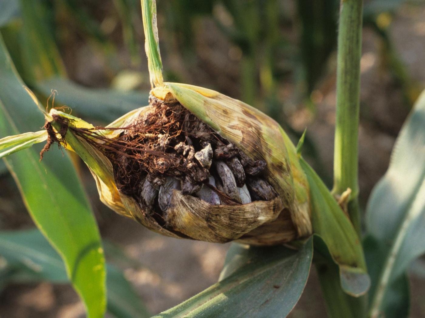 Légende: Spores noires d'Ustilago sur épi de maïs grain et fourrager