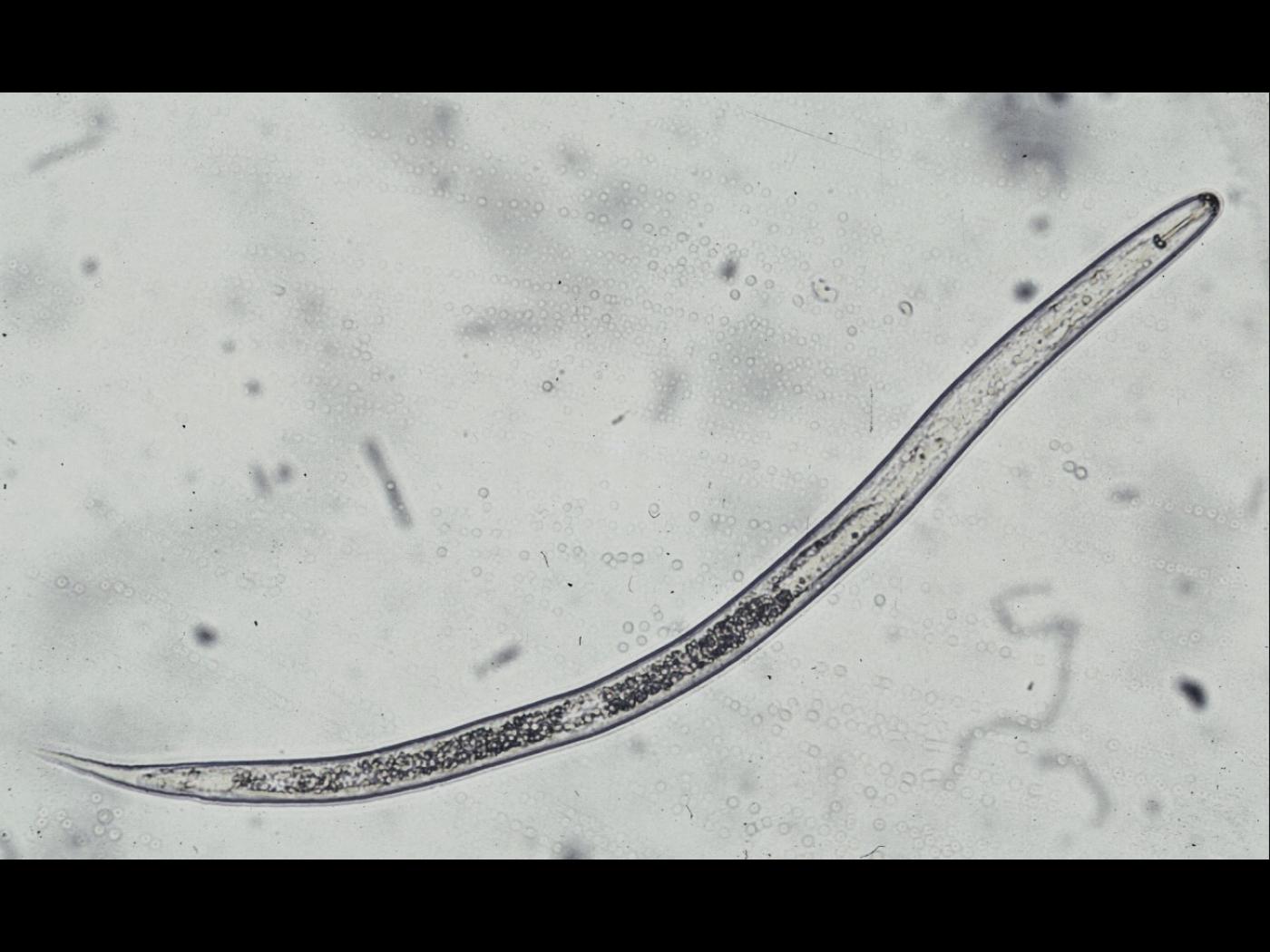Description: Larve juvénile de Heterodera glycines extraite d'un échantillon de sol par l'entonnoir de Baermann.