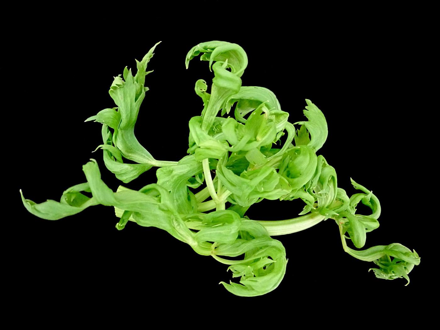 Description: Un plant de céleri (cv 'Tango') a été dépouillé de quelques branches extérieures pour montrer une partie du cœur. On observe des malformations sévères du jeune feuillage qui se caractérisent par des feuilles tordues, enroulées et parfois soudées. On aperçoit quelques feuilles extérieures jaunâtres non déformées. Tous les pétioles sont intacts. Les tests de laboratoire ont révélé la présence de phytoplasmes dans les vaisseaux conducteurs des feuilles. Il pourrait s’agir du phytoplasme de la jauni… En savoir plus