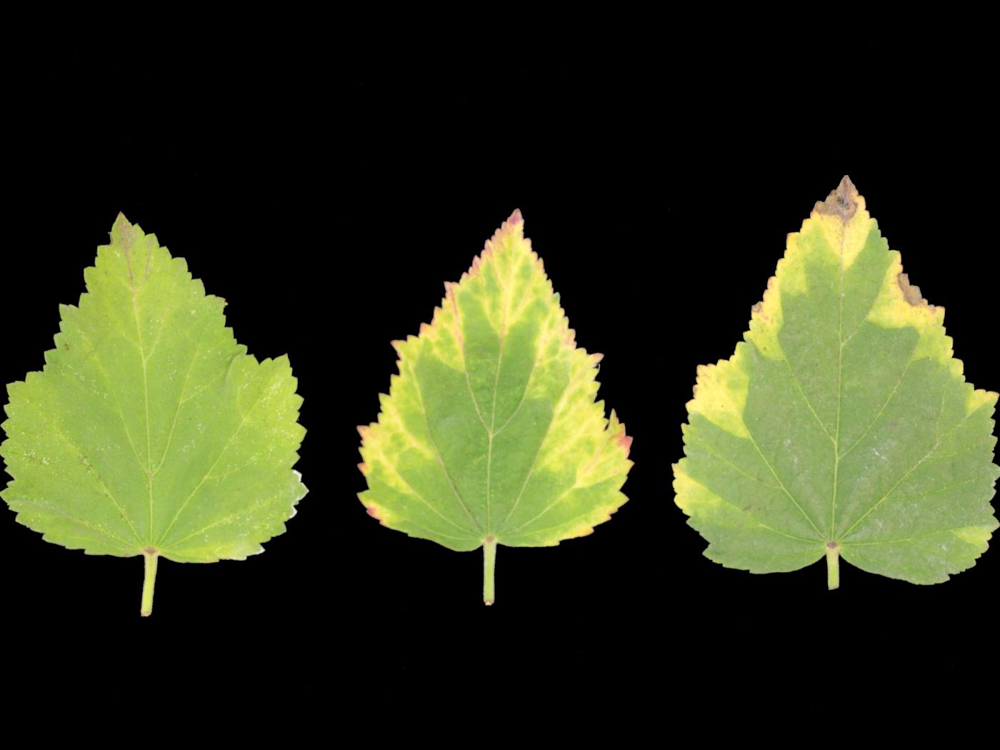 Feuille : jaunissement du limbe et éclaircissement des nervures des jeunes feuilles. Les vieilles feuilles deviennent bronze à rouges à pourpres. Les feuilles peuvent être enroulées et déformées. Lorsque l’infection survient tôt dans le développement de la plante, la croissance est ralentie, les feuilles forment des rosettes et sont souvent plus étroites que les feuilles saines.