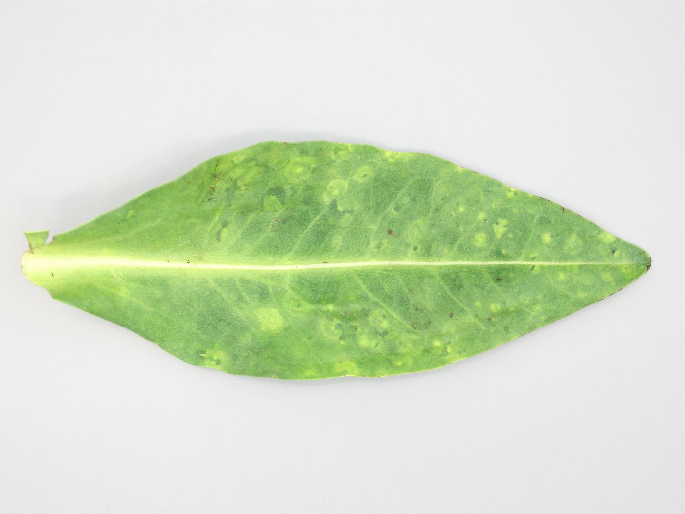 Description: Une feuille de stokésie (cv 'Divinity') montre de nombreuses taches en anneaux concentriques jaunes. Les tests de laboratoire ont révélé la présence du virus de la maladie bronzée de la tomate (TSWV). La conseillère agricole mentionne que plus de 50 % des plants de la pépinière sont affectés et les symptômes sont présents sur tous les niveaux de feuille. Les symptômes sont apparus graduellement à la suite de pluies abondantes et d’humidité relative élevée.