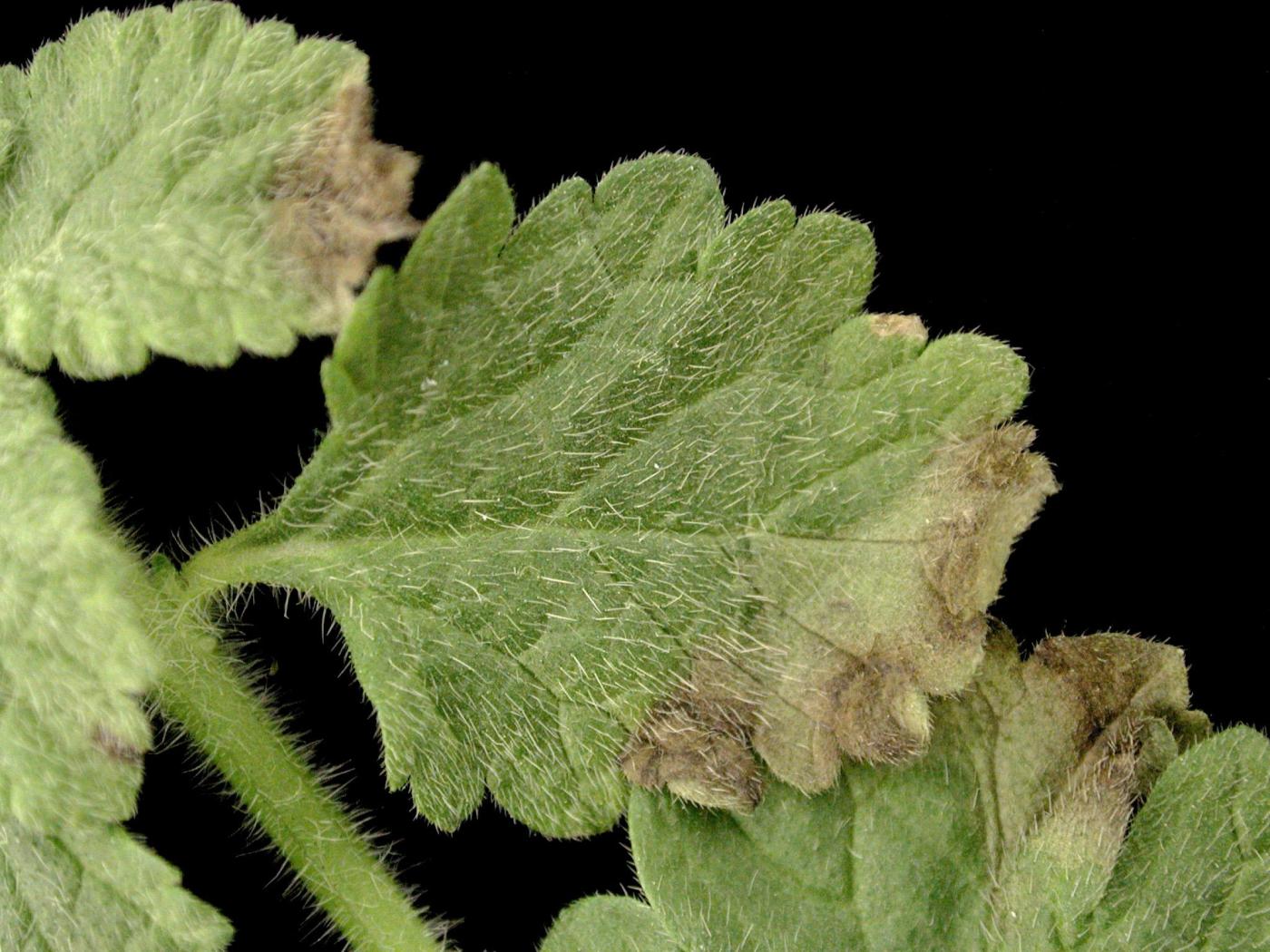 Feuille : présence de taches de différentes teintes avec une marge foncée ou non, de taches en anneaux, de mosaïques, de marbrures, de lignes ou de stries de différentes teintes, en zigzag ou non, et des nervures décolorées, foncées ou nécrotiques. Les taches peuvent débuter à l’apex, à la marge ou longer les nervures. Le feuillage est parfois jaune, déformé et gaufré. Flétrissement, dépérissement et chute des feuilles. Le pétiole peut brunir et dépérir.