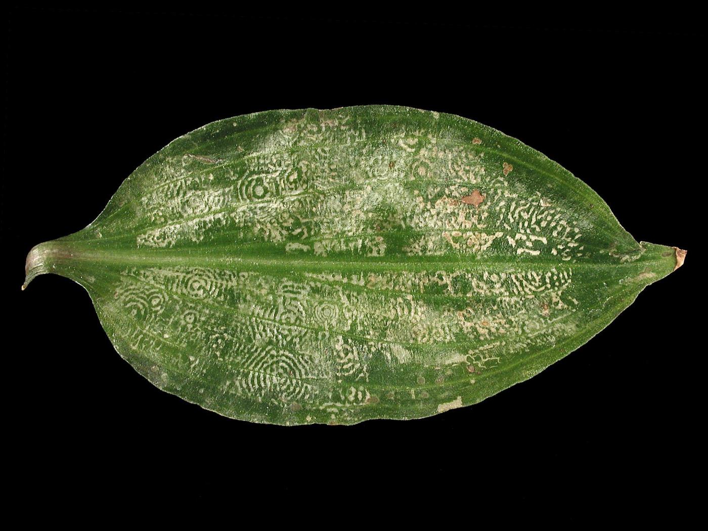 Description: Une feuille d’aneilena (cv 'Papuawa') montre de nombreux anneaux concentriques blancs à la face supérieure. Les symptômes affectent tous les niveaux de feuille. Les tests de laboratoire ont révélé la présence du virus du bruissement du tabac (TRV).