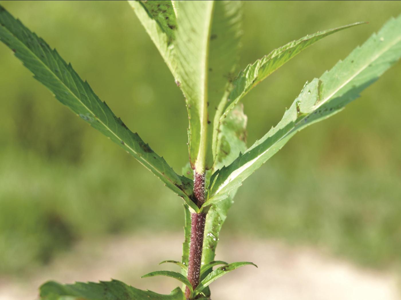 Les feuilles sont opposées, pouvant être soudées par la base autour des nœuds de la tige. Le limbe est de forme lancéolée à linéaire, il mesure de 4 à 10 cm de longueur et de 0,5 à 2,5 cm de largeur. La marge est de plus en plus dentée vers le haut de la plante. La nervure centrale est proéminente.