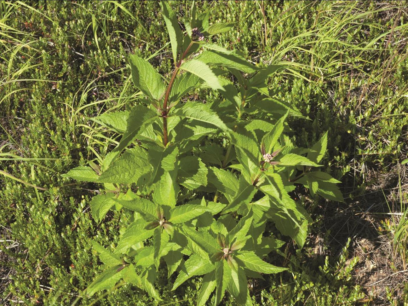 Les feuilles sont disposées en verticilles bien espacés sur la tige. De 4 à 7 feuilles sont présentes par verticille. Le limbe est de forme lancéolée elliptique à lancéolée ovée, il se termine en pointe et a une marge dentée. Il mesure de 8 à 25 cm de longueur et de 2,5 à 9 cm de largeur. Les feuilles sont recouvertes de poils à la face supérieure et elles sont habituellement glabres à la face inférieure. Elles sont portées par un pétiole glabre qui mesure de 0,1 à 2,5 cm de longueur.