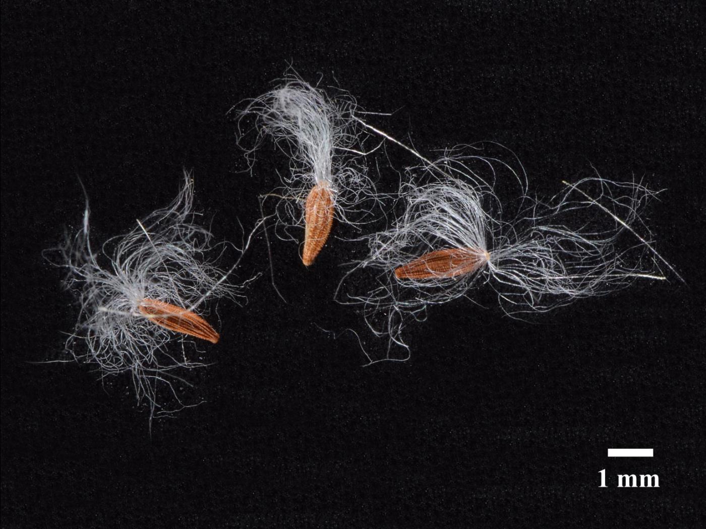 Les fruits sont des cypsèles de couleur brun paille à brun rougeâtre. Elles sont minces, aplaties et modérément ailées sur la marge. Elles sont de forme ellipsoïde et mesurent 2,5 mm de longueur. Elles ont de 3 à 5 nervures longitudinales sur chaque face. Elles possèdent une aigrette constituée de longues soies blanches non ramifiées mesurant de 6 à 9 mm de longueur. Les soies au centre sont rigides et celles en périphérie sont flexibles et munies d’un apex en crochet.