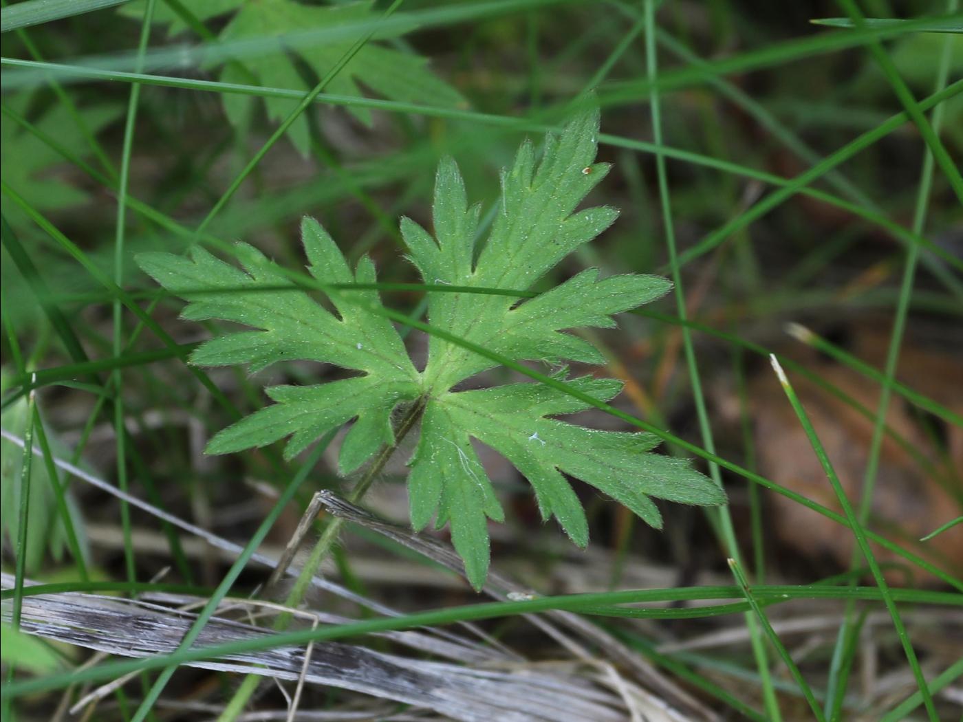 Les feuilles sont alternes sur la tige et mesurent de 1,8 à 5,5 cm de largeur et de 2,5 à 10 cm de longueur. Le limbe est divisé en 3 à 5 segments (palmatipartite à palmatiséquée). Le segment médian n’est pas pétiolulé, c’est la base du limbe qui s’étire vers le bas. La marge des feuilles au bas de la tige est profondément dentée, découpant chaque segment en 2 à 3 parties. Au haut de la tige, la marge des feuilles est moins profondément dentée.