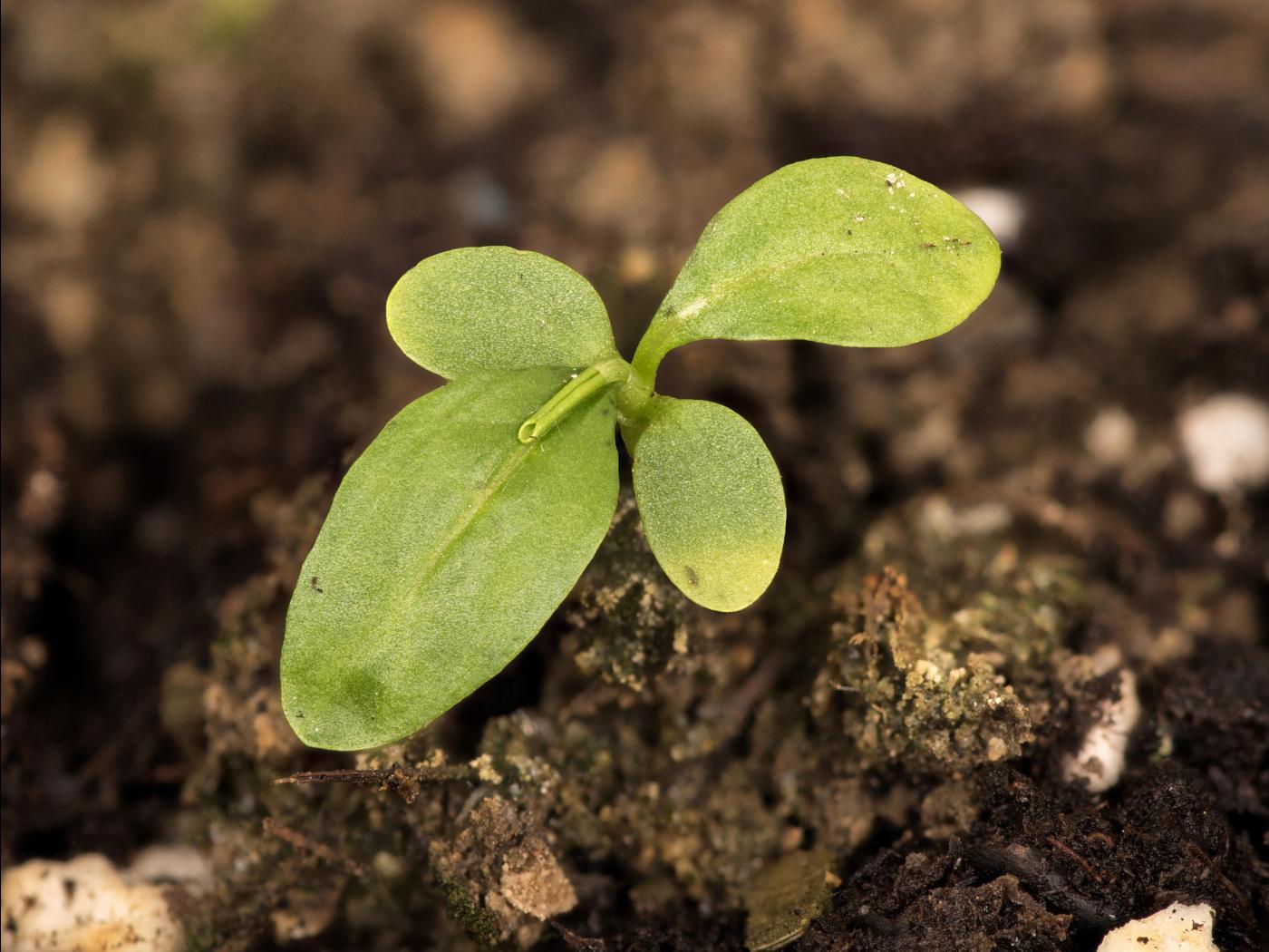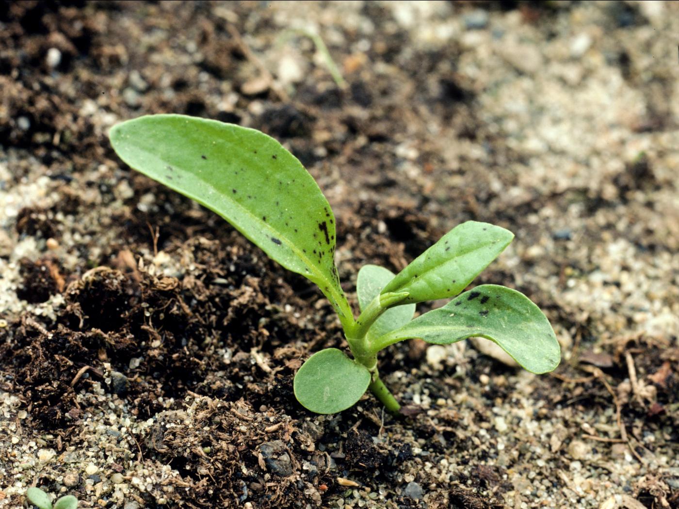 La plantule est à tige et feuilles alternes. Les cotylédons sont de forme oblongue à sommet arrondi et mesurent de 5 à 10 mm de longueur. La face inférieure est de couleur verte à rouge violet, la face supérieure est verte et présente quelques petits points noirs épars. Les premières feuilles sont arrondies à allongées et à marge entière. Le limbe est tacheté de petits points noirs.