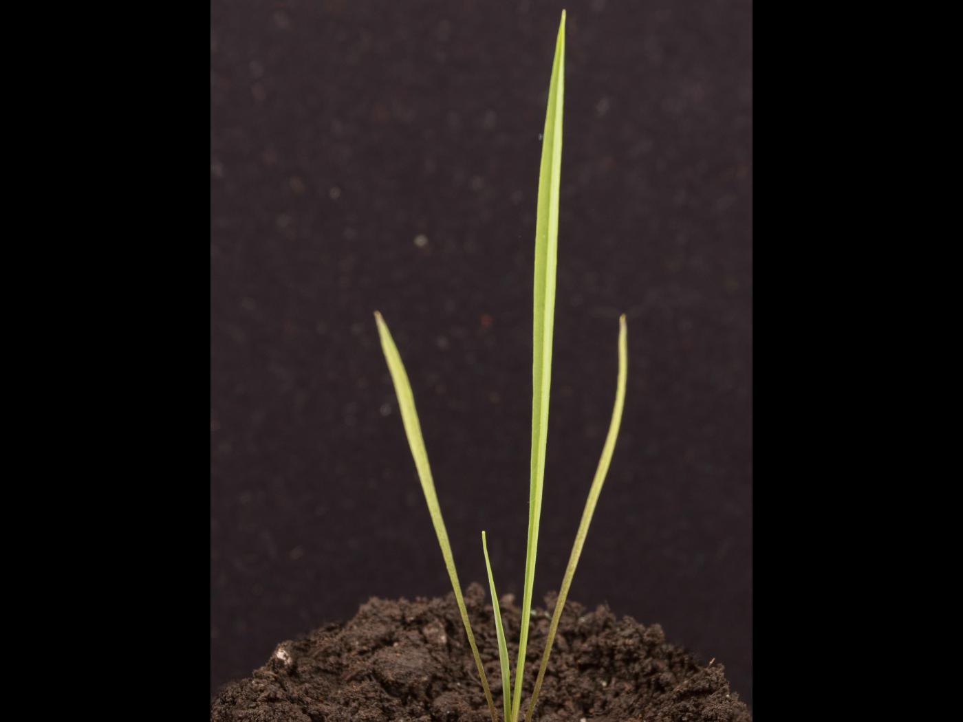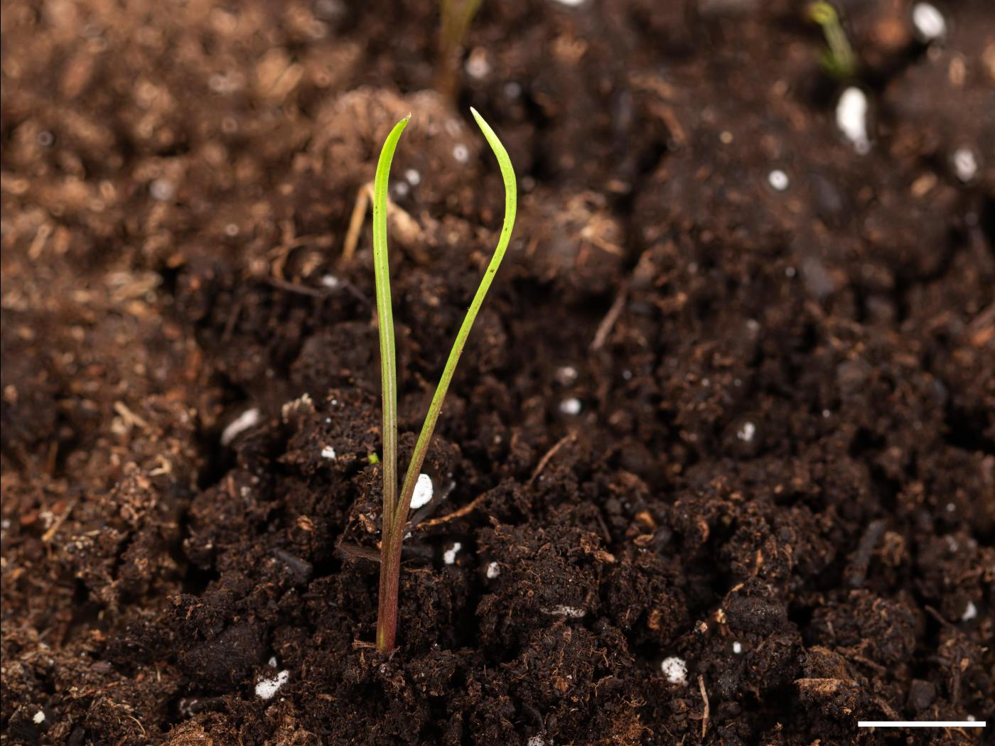 La plantule comprend des feuilles alternes disposées en rosette dressée. Les cotylédons sont de forme linéaire et mesurent de 3 à 5 cm de long. Leur base est soudée et forme un tube. Les premières feuilles sont allongées et ne se déplient pas en entier (en forme de V).