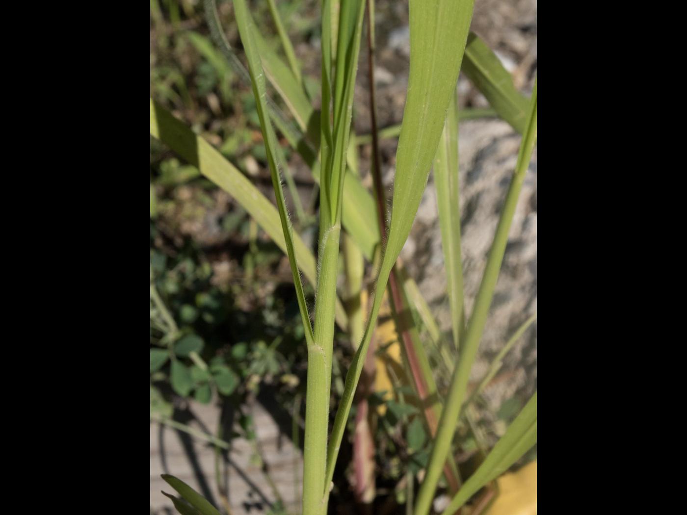 Les feuilles sont étroitement lancéolées et terminées en pointe. Elles mesurent souvent plus de 20 cm de longueur et de 1 à 2 cm de largeur. Le limbe est plat et se rétrécit à sa base, près de la ligule. De nombreux poils courts sont présents sur la face supérieure du limbe, parfois aussi sur la face inférieure. Les marges de la gaine sont munies de poils. La ligule est constituée d’une rangée de poils hérissés d’environ 2 mm de longueur.