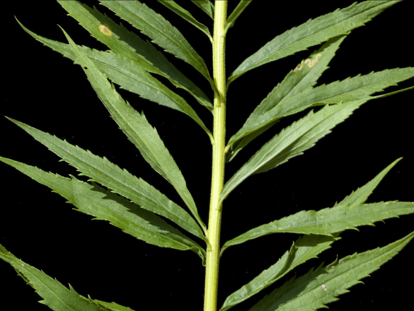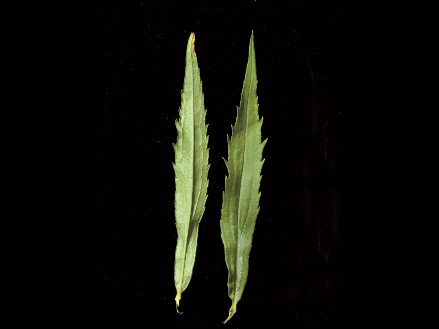 Les feuilles sont alternes et sessiles sur la tige. Elles sont légèrement rugueuses au toucher et présentent une pubescence blanchâtre sur la face inférieure. Les feuilles matures sont de forme lancéolée à allongée et se terminent en pointe. La marge du limbe est dentée. Elles mesurent de 5 à 15 cm de longueur et de 1 à 3 cm de largeur. Elles portent 3 nervures apparentes naissant de la nervure principale.