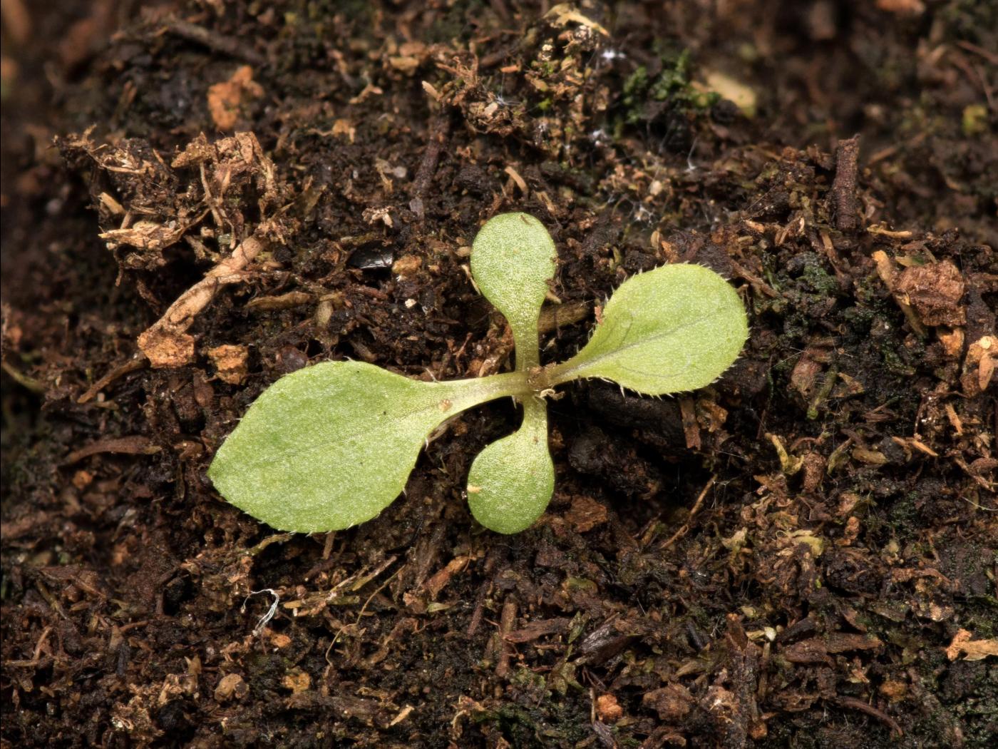 La plantule est composée de feuilles alternes qui forment une rosette. Les cotylédons sont de forme oblongue et mesurent de 1,5 à 2,5 mm de longueur. Les premières feuilles sont pubescentes, de forme arrondie à ovale, le bord du limbe porte de 1 à 2 encoches ou quelques dents grossières. Les cotylédons se dessèchent rapidement après l’apparition des feuilles.