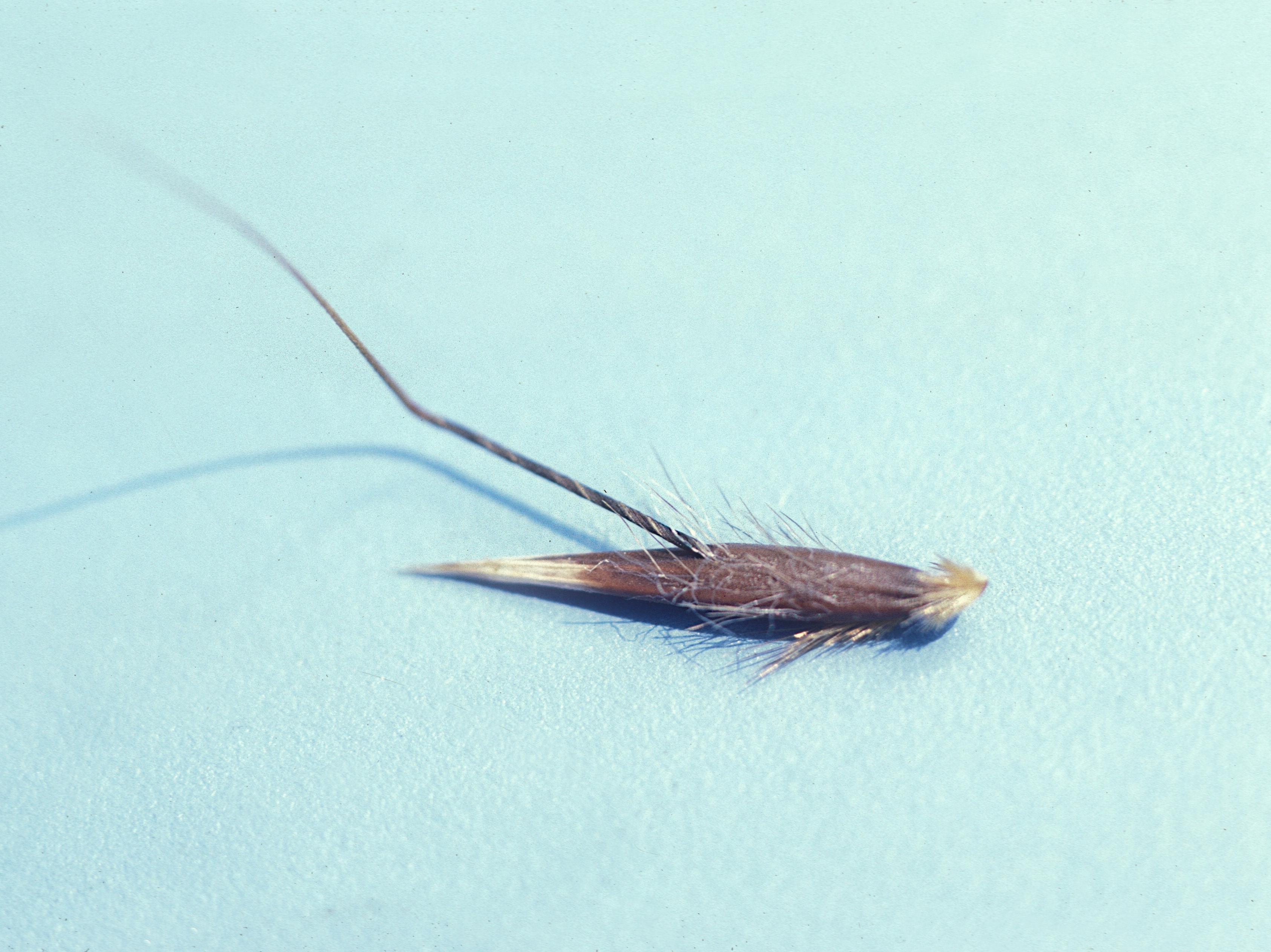 Graine (caryopse) couverte de longs poils, arête spiralée au dos