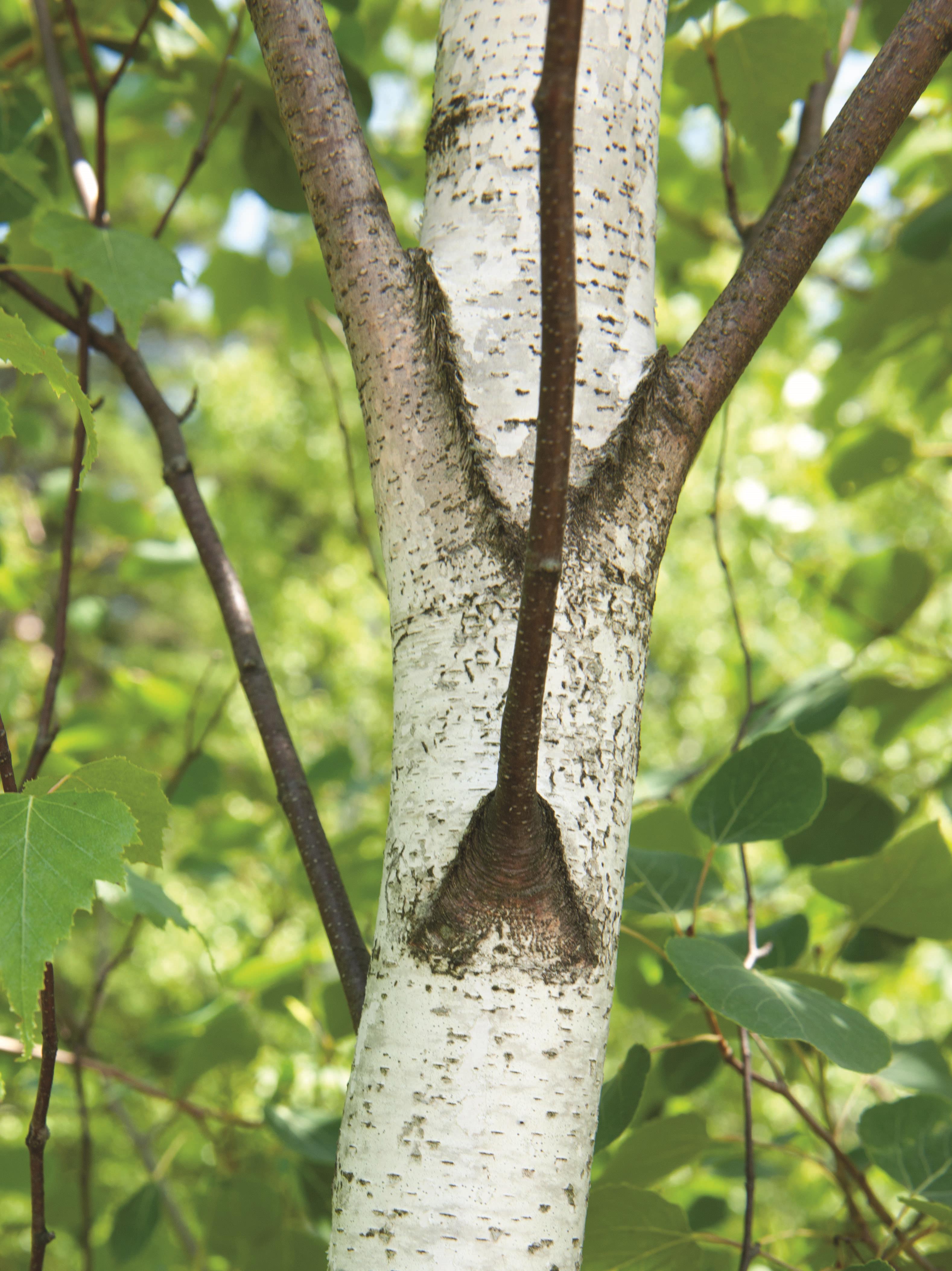 Tronc, écorce avec des taches noires triangulaires à l'aisselle des branches