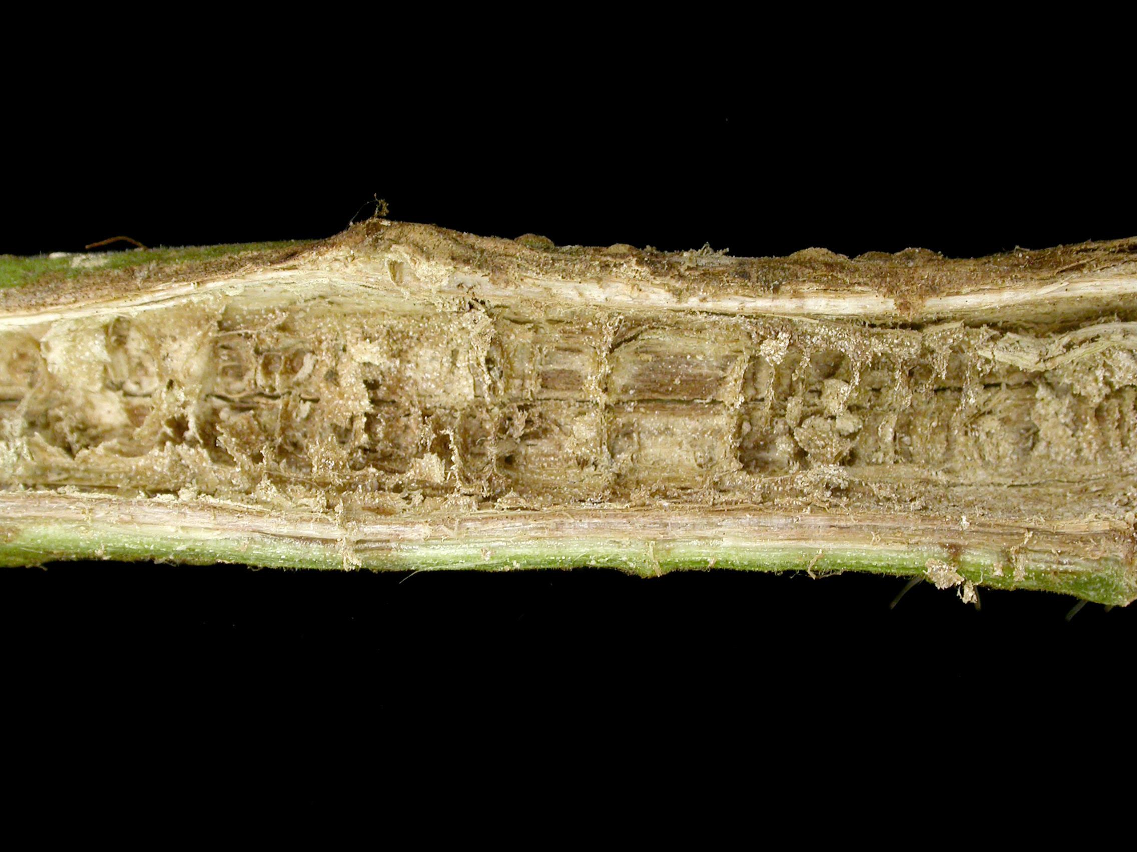 Une coupe longitudinale d’un chancre de tige de tomate de serre (cv 'Trust') montre des tissus internes bruns (vaisseaux et moelle), creux et secs. Les tests de laboratoire ont révélé la présence de Phytophthora nicotianae, responsable du pourridié phytophthoréen chez la tomate.