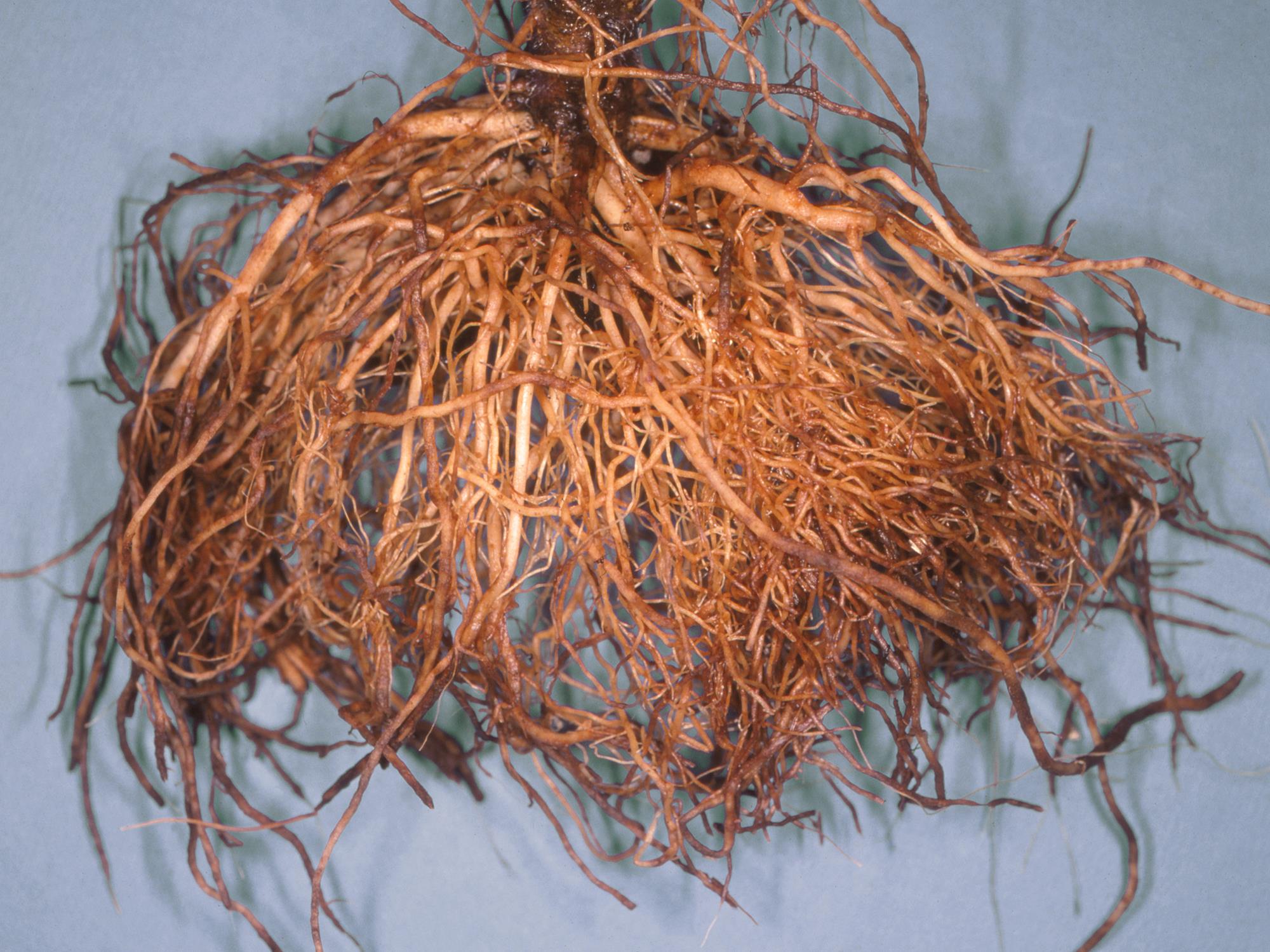 Le système racinaire d’un plant de tomate de serre montre des racines renflées, brunes et liégeuses, dont l’épiderme se détache facilement. Les observations microscopiques ont révélé la présence du champignon Pyrenochaeta lycopersici, responsable de la racine liégeuse chez la tomate.