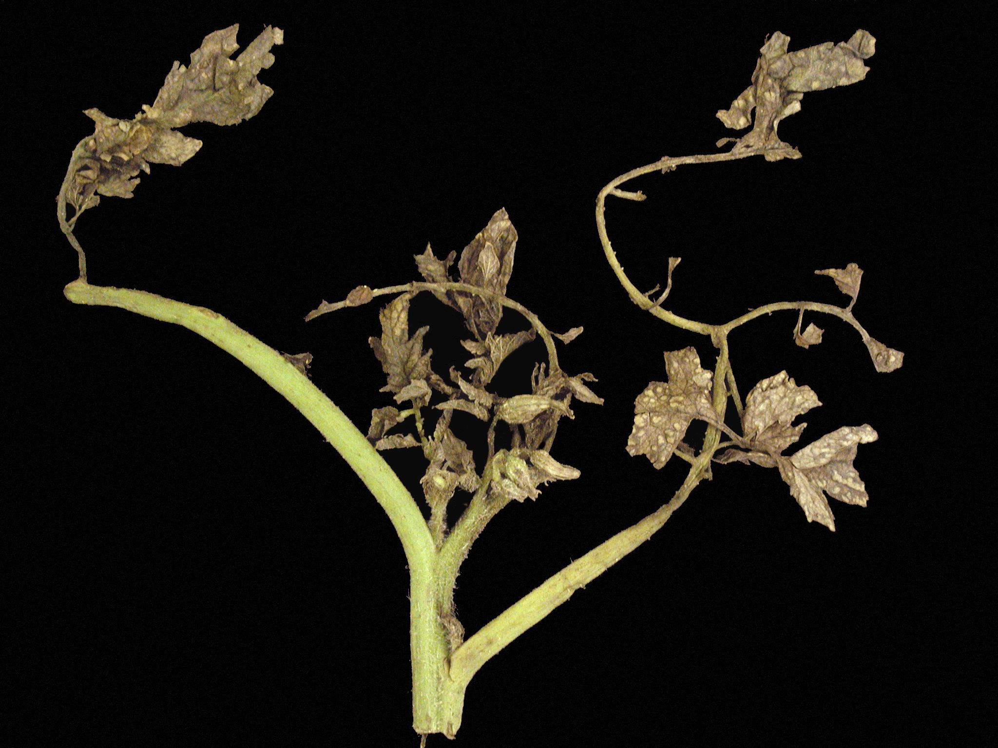Les feuilles dans la tête d’un jeune plant de tomate de serre (cv 'Trust') sont complètement brûlées et les feuilles médianes et basales montraient une large brûlure à la marge. Les tests de laboratoire ont révélé une conductivité électrique très élevée (11,2 mS/cm) dans le substrat (bran de scie) et aucun champignon ni bactérie n’a été détecté des dommages. Les symptômes sont la conséquence d’une salinité trop élevée. La conductivité électrique devrait se situer autour de 2,5 mS/cm.