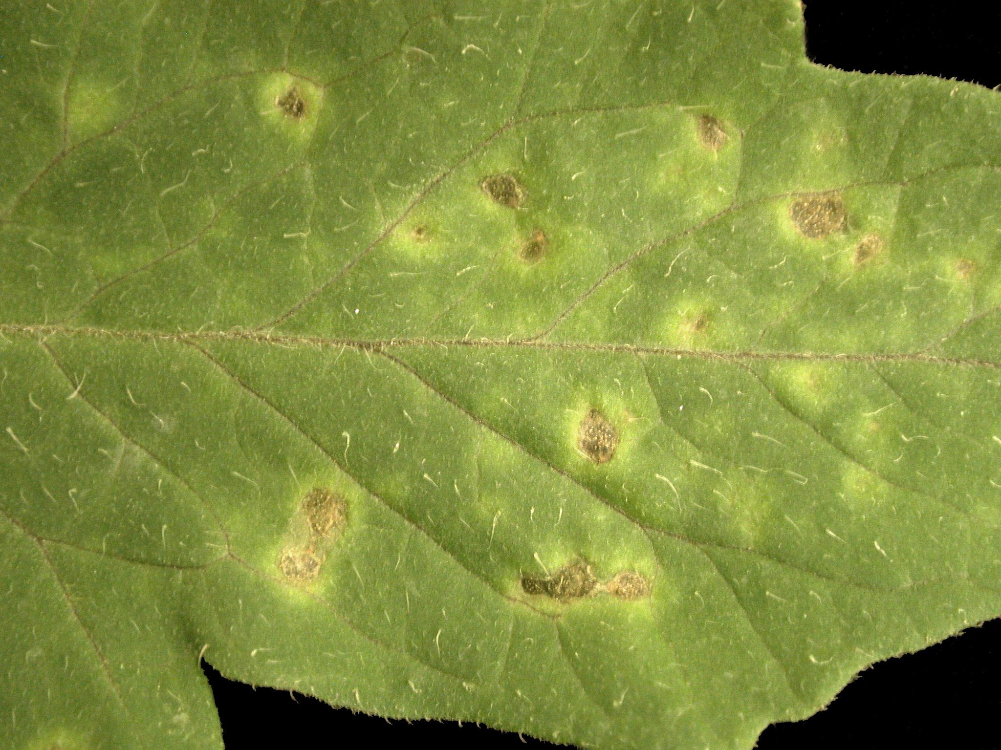 Une vue rapprochée d’une foliole de tomate de serre montre à la face supérieure des taches circulaires ayant au début une coloration uniforme jaune et dont le centre devient brun par la suite. La face inférieure de la foliole avait la présence de protubérances vertes qui sont devenues brunes par la suite (non visible ici). Ces symptômes sont caractéristiques de l’œdème. Tous les plants de la serre étaient porteurs de ces symptômes.