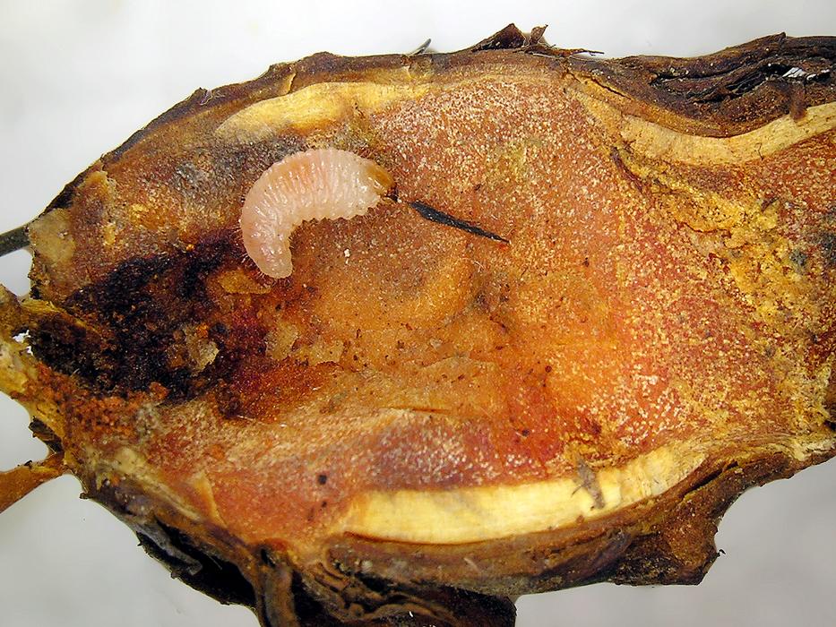 Coupe transversale du collet d'un plant de fraisiers avec une larve de charançon noir de la vigne et les dommages associés. À gauche, on observe la galerie creusée par la larve avec la présence d'excréments (section brun foncé). Le dégât d'alimentation de la larve cause un affaiblissement de la plante, entraînant parfois le rougissement de la marge des feuilles suivi du flétrissement et de l'assèchement du plant à l'apparition des fruits.