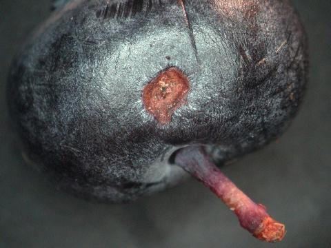 Bleuet présentant un dégât d'alimentation d'un adulte de charançon de la prune. La forme du dégât est plus arrondie que la cicatrice de ponte qui est en forme de croissant. Ce type de dommage s'observe sur les fruits mûrs (à l'automne) alors que les cicatrices de ponte s'observent surtout sur les fruits verts.