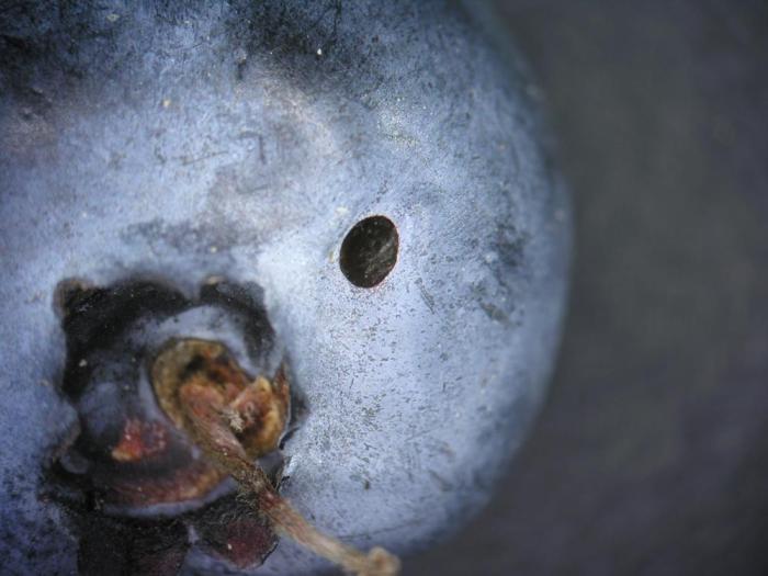 Bleuet présentant un trou en surface qui se prolonge en galerie dans la chair. Des excréments sont visibles. Plusieurs espèces sont susceptibles de causer ce type de dommages, notamment les tordeuses Grapholita packardi et Grapholita prunivora.