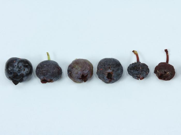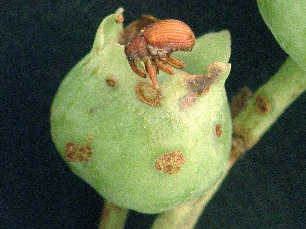 Bleuet vert présentant des dommages causés par l'espèce Pseudanthonomus seriesetosus (un adulte visible sur la photo). Le grignotement du fruit par les adultes entraîne l'apparition de cicatrice liégeuse à la surface de l'épiderme. Cette espèce est spécifique au genre Vaccinium spp.