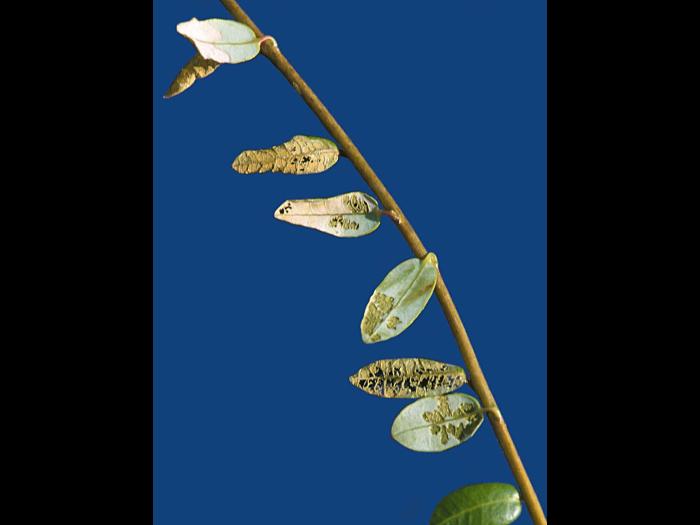Un champ de canneberge présentant des zones où le feuillage brunâtre témoigne d'une forte activité d'altises à tête rouge. Les dégâts, causés par le grignotement des adultes, sont observables au mois d'août.