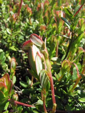 Tiges de canneberge présentant des dommages causés par des larves de la tordeuse de la vigne. On observe que les feuilles terminales de ces nouvelles tiges sont enroulées par des toiles tissées. Ce dégât est visible au printemps et est causé par les larves de la première génération. Les zones sévèrement infestées deviennent brunâtres en raison du grignotement des chenilles qui ne laissent que les nervures principales des feuilles. Les chenilles de la deuxième génération se nourrissent des feuilles, des fleurs ainsi que des fruits.