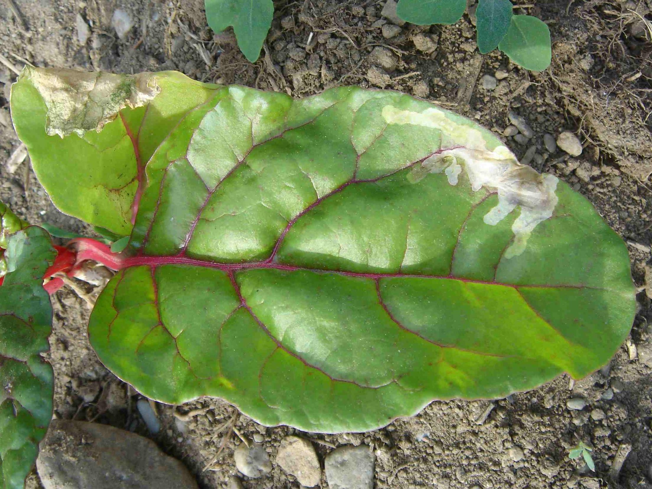 Dommages causés par la mineuse de la betterave : la larve de Pegomya betae creuse de larges mines entre les deux épidermes des feuilles de betterave. Les sections du feuillage qui sont attaquées prennent un aspect bombé et blanchâtre. On peut apercevoir les chemins qui ont été tracés par la larve qui est présente à l'intérieur de la plante hôte.
