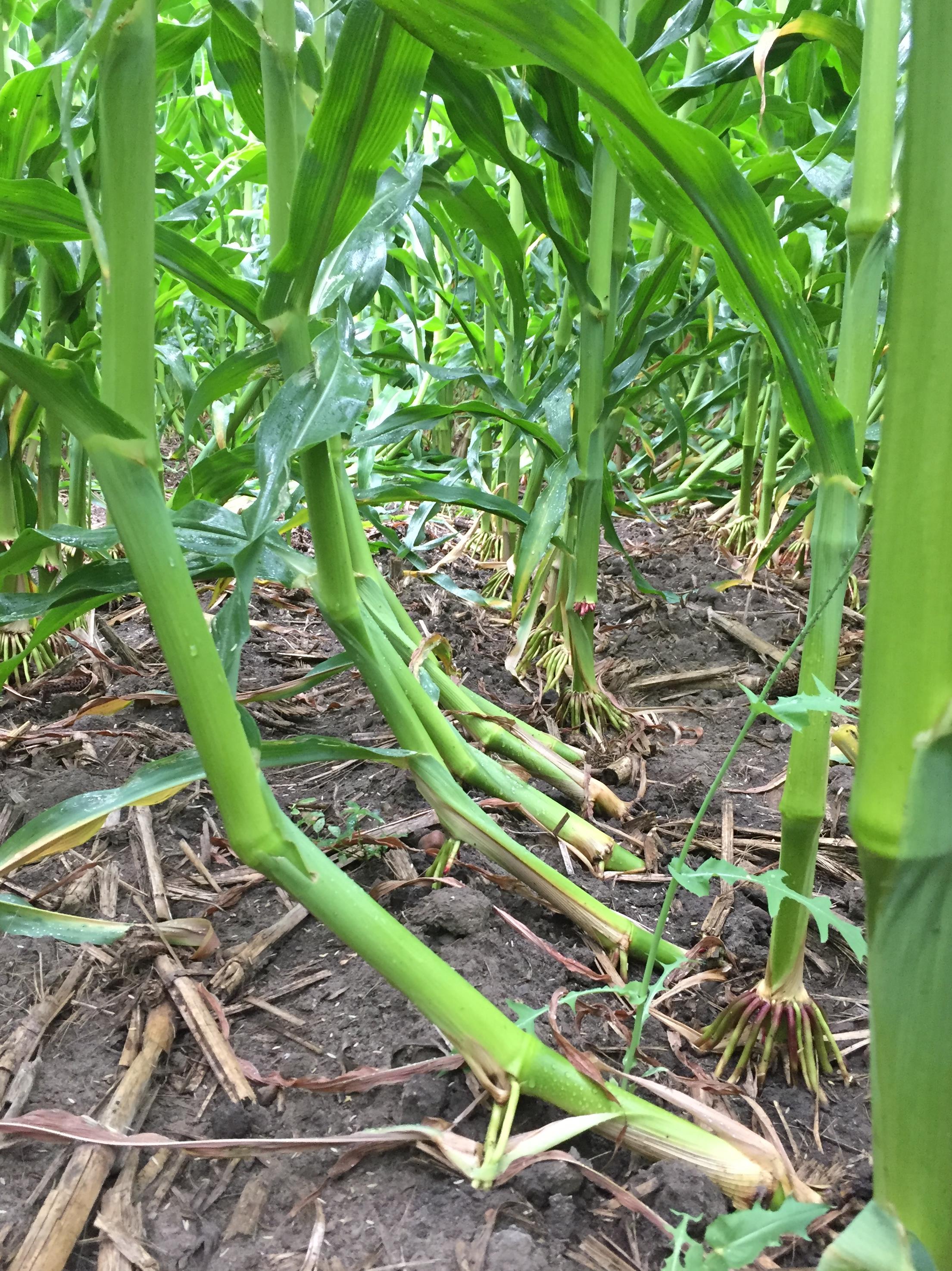 Des plants de maïs avec la tige recourbée en forme de col de cygne, symptôme résultant des dommages causés par des chrysomèles des racines : les larves se nourrissent presque exclusivement de racines de maïs. Les jeunes larves grignotent les radicelles alors que les larves plus âgées creusent des galeries dans les racines d'ancrages. Les plants endommagés sont alors susceptibles de pencher ou de verser. Certains plants prennent alors la forme d'un col de cygne lorsqu'ils se courbent vers le haut dans un effort pour se redresser. Les larves transmettent les Fusarium des racines.