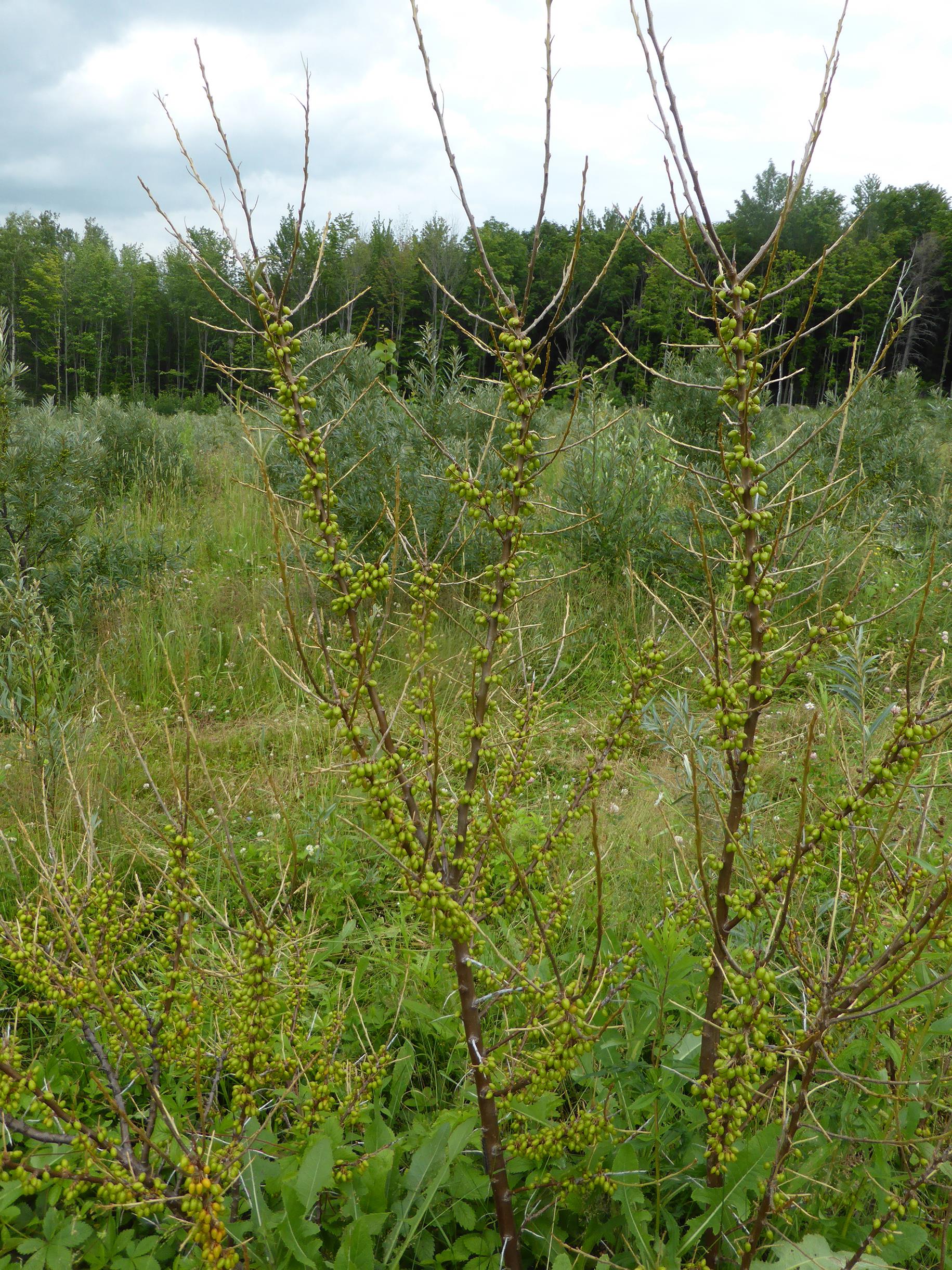 La spongieuse grignote le feuillage des plants d'argousier et peut causer une importante défoliation de ceux-ci. Sur la photo, on observe un plant complètement défolié par les larves de spongieuses en juillet. Il ne reste que les fruits en développement le long des tiges.