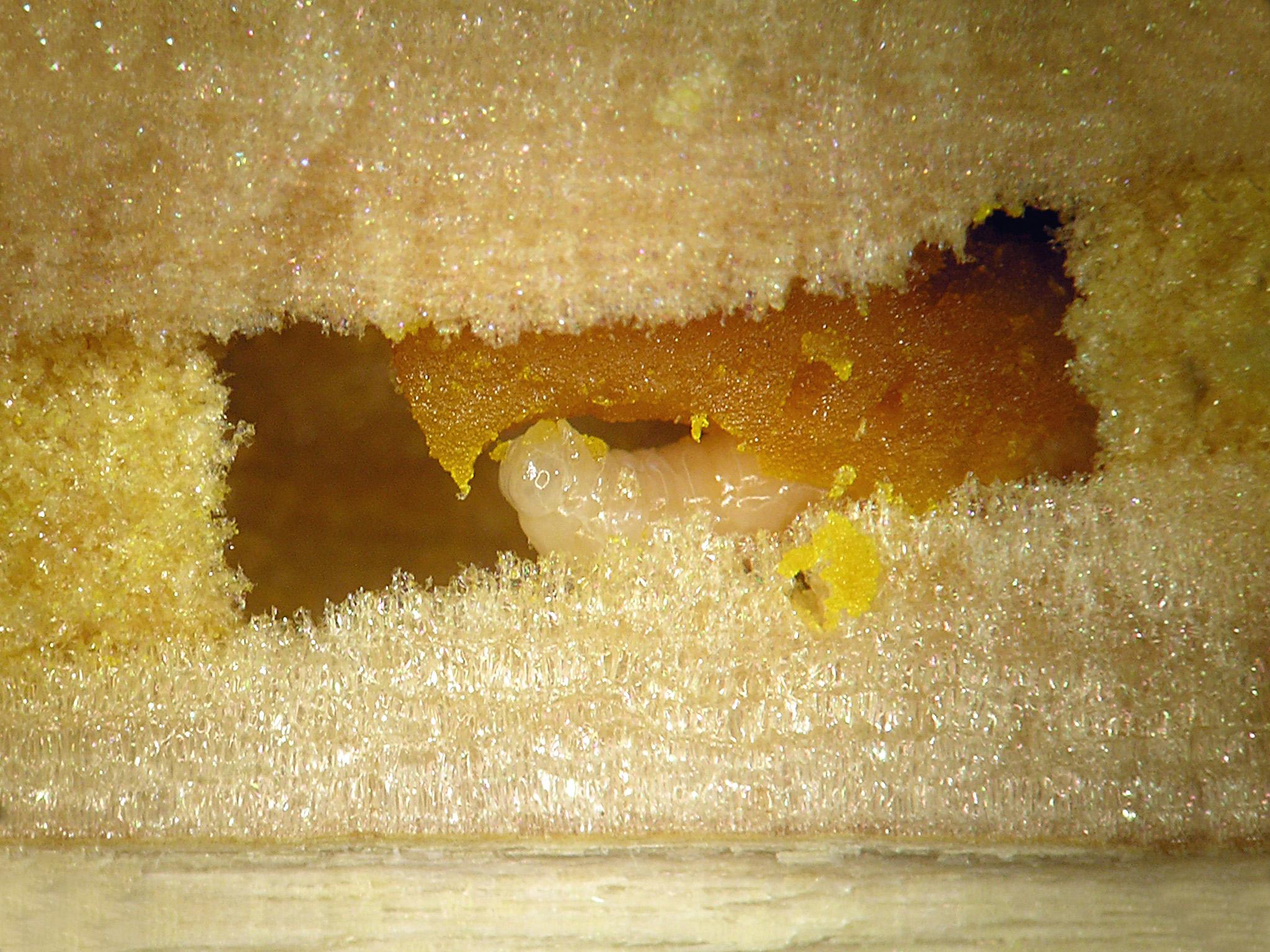 Gros plan de la partie antérieure de la larve à l'intérieur d'une cellule dans une tige de framboisier (on peut difficilement distinguer la tête).