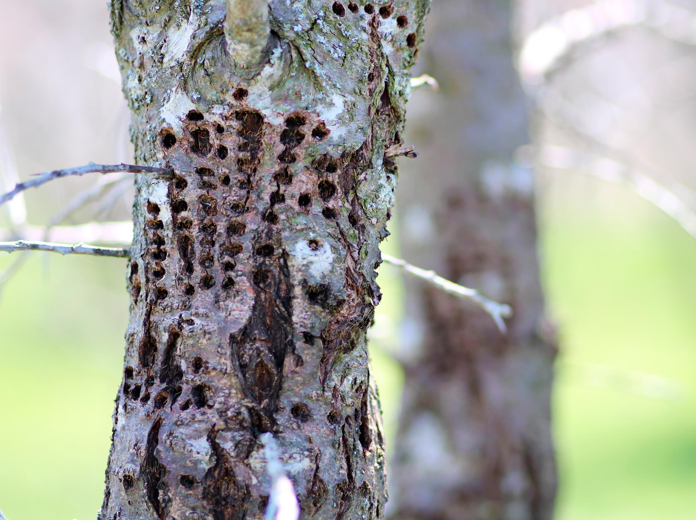 Sur cette photo, on observe de petits trous ovales, réparties en file horizontale. Ce tronc d’argousier mature est fortement affecté par le pic maculé. Les perforations faites par l'oiseau empêchent la sève de bien circuler dans l'arbre. On remarque même un étranglement au niveau de la zone affectée. Il souffrira de ces blessures de manière permanente.
